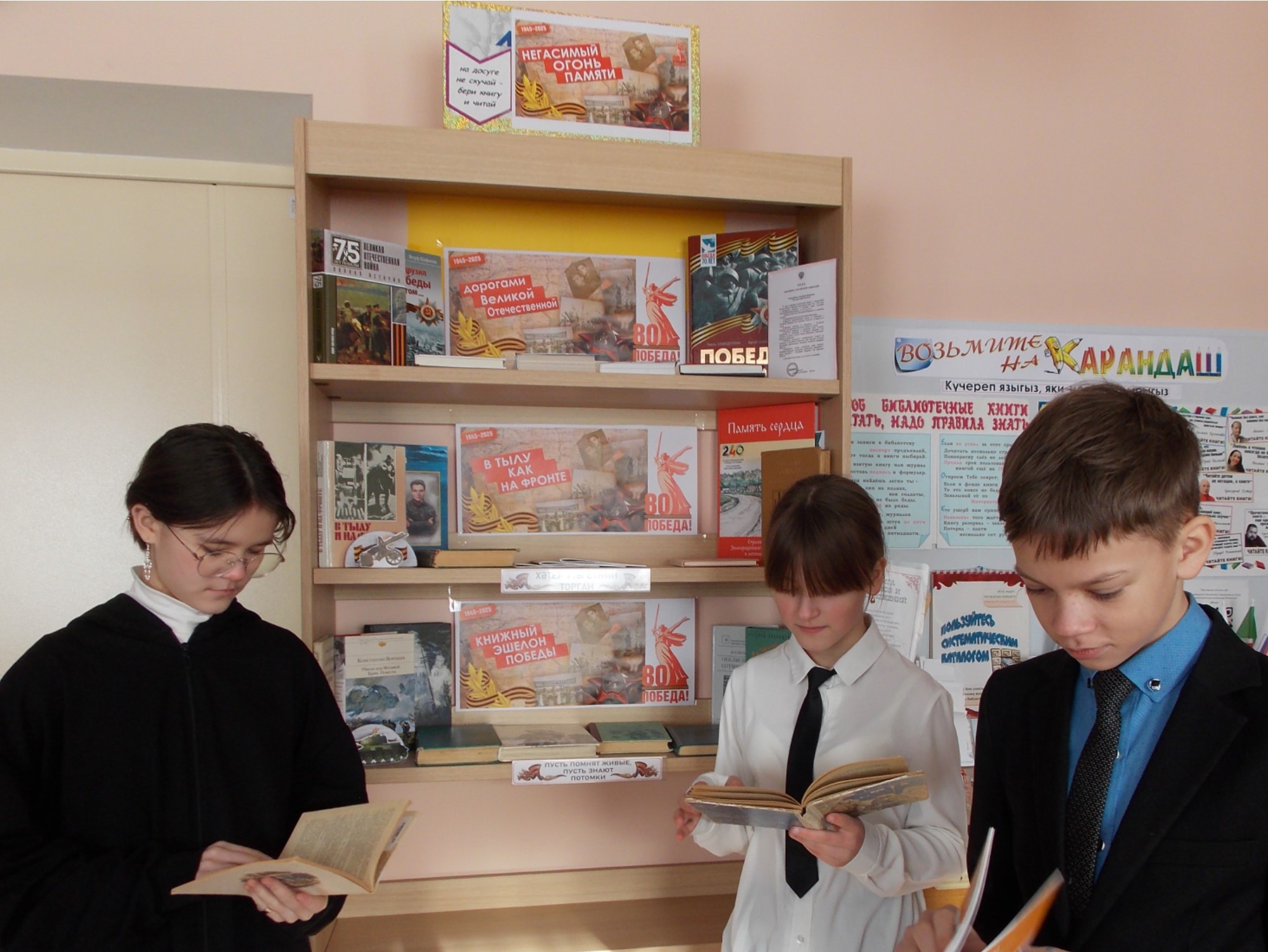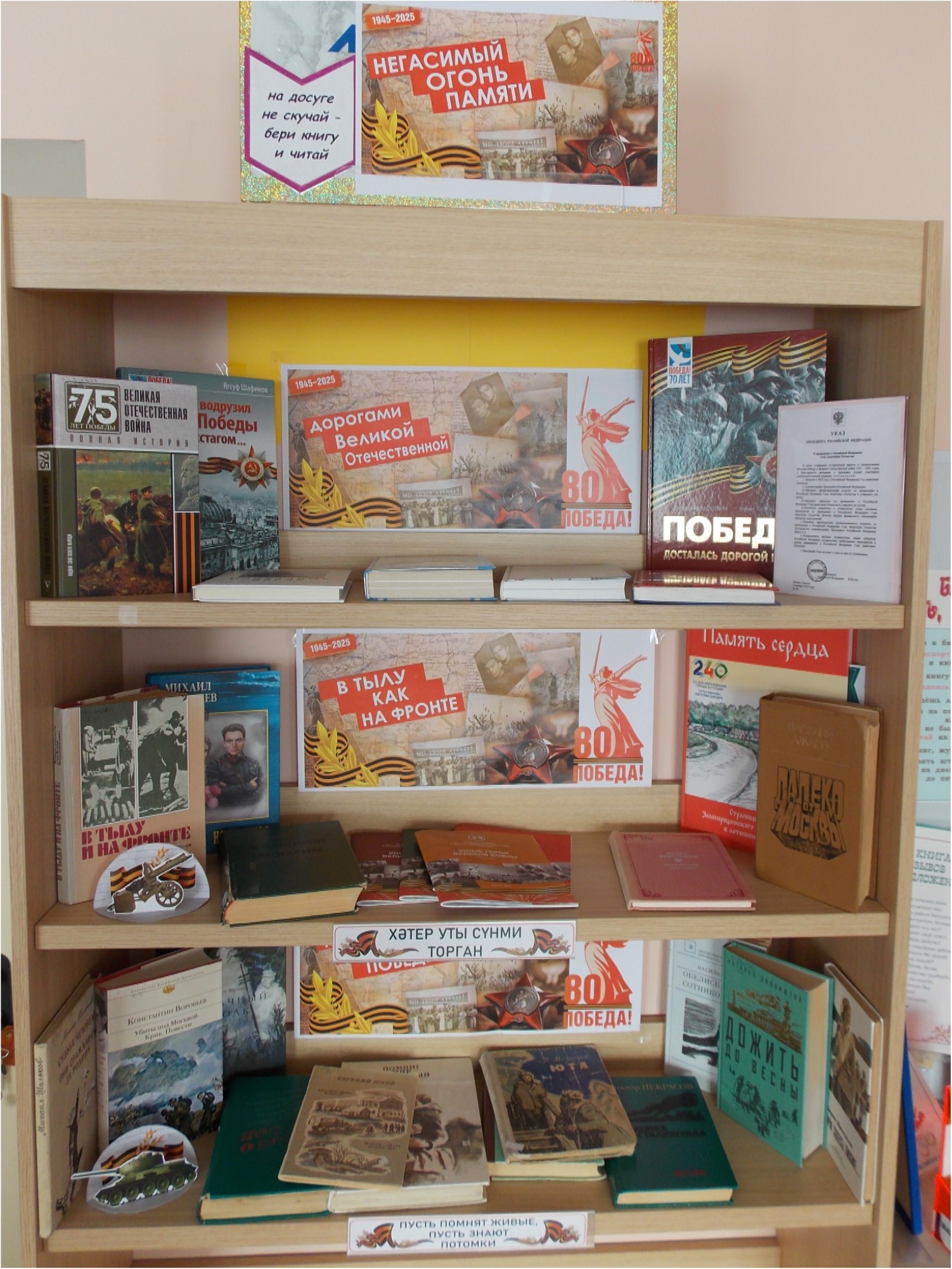 В Зеленорощинской сельской библиотеке Бугульминского района был организован обзор выставки «Негасимый огонь памяти» с разделами: «Дорогами Великой Отечественной», «В тылу как на фронте», «Книжный эшелон Победы». Литература, представленная на выставке, ознакомила читателей с историческими фактами: началом Великой Отечественной войны, с ее ходом и завершением, а также вкладом тружеников тыла и ролью России в победе над фашизмом. Особое место на выставке заняли произведения писателей-фронтовиков: М.Шолохова, Б.Полевого, А.Адамовича, В.Закруткина, Ю.Бондарева, В.Некрасова, В.Астафьева, Б.Васильева и других. Прочтение художественной и краеведческой литературы о войне позволило читателям прикоснуться к героическому времени, вспомнить воинов-защитников, отстоявших мир в жестокой битве.