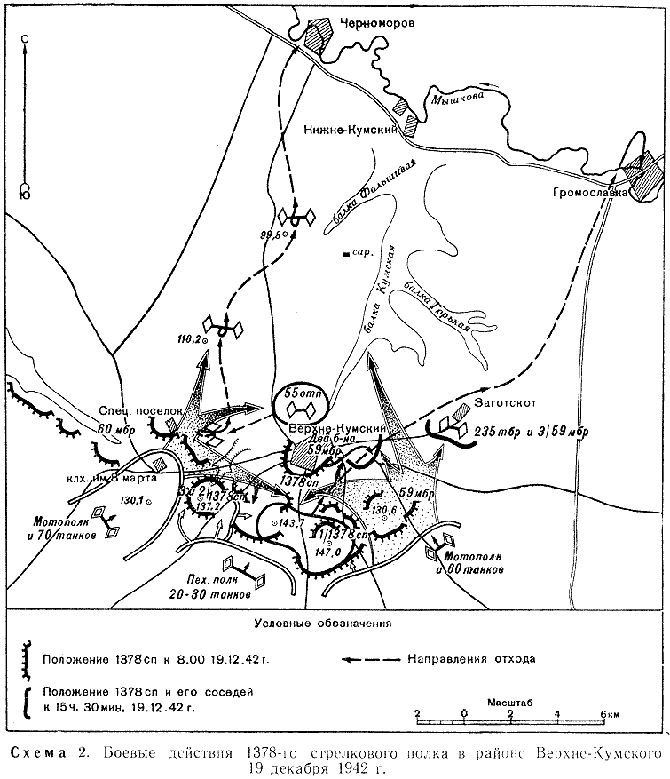 Получив приказ пробиваться к Паулюсу, армейская группа «Гот» 17 декабря 1942 г. наткнулась на небольшую, казалось бы, преграду – несколько высот в донской степи у хутора Верхне-Кумский Калачевского района. Их-то и обороняли бойцы 1378 стрелкового полка 87 стрелковой дивизии. Высоту 137,2 обороняли бронебойщики роты под командованием старшего лейтенанта Николая Наумова с двумя расчетами противотанковых ружей. Боевое донесение командующего войсками Сталинградского фронта Еременко № 412 от 19 декабря 1942 г. гласит: «Части 3 гв. мехкорпуса и 1378 сп 87 сд, героически оборонявшие район Верхне-Кумский и выдержавшие до 5 атак танков и пехоты противника, почти полностью были уничтожены, и только после этого противнику удалось прорваться на север и выйти на рубеж реки Мышковка.» Оставшиеся в живых 24 красноармейца уничтожили огнем ПТР и гранатами 18 танков наступавшего противника и погибли. «Наступление окончилось неудачей, - пишет в своей книге «Поход на Сталинград» бывший офицер вермахта Г.Дерр - из-за хорошо организованной противотанковой обороны; понеся тяжелые потери, наша бригада отошла назад.» Фашисты потеряли в этих боях до 60% мотопехоты и 230 танков и их наступательные возможности были подорваны.