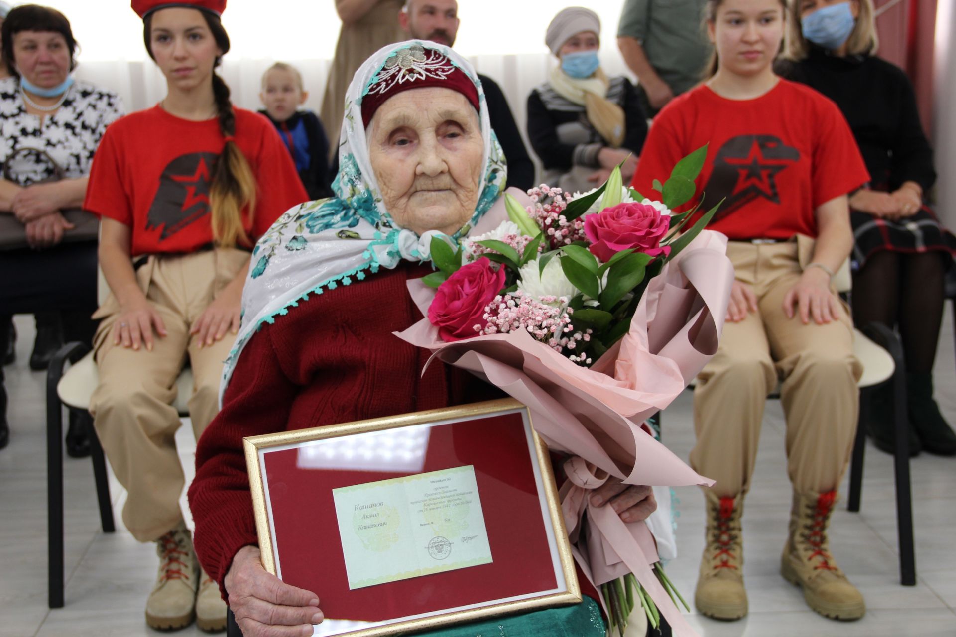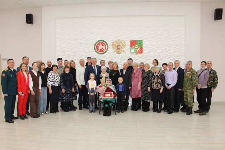 «Товарищ Кашапов в борьбе с германским фашизмом проявил исключительный героизм и отвагу. Командуя взводом 7 июля 1941 года в бою на «Чертовом перевале» был послан для отрезания пути отступающему противнику. С этой задачей он справился отлично, отрезав путь и уничтожив большую часть отступающего противника. Лично он в этом бою уничтожил одну «кукушку» и вывел из строя один станковый пулемет противника. В бою 16-17 июля 1941 года на высоте 314,9 после ранения командира роты, он принял командование на себя. При штурме этой высоты он первым со своей ротой зашел на нее и преследовал отступающего противника, уничтожая в первую очередь оставленные им огневые точки» написано в его наградном листе.Около 40 человек, родственников Акмала Кашапова, собрались в зале в память о погибшем герое.Участие юнармейцев в церемонии придало мероприятию особый смысл. Торжественно внесли они знамена. Минутой молчания присутствующие почтили память погибших на войне.- Приятно видеть в зале такую большую поддержку, родных командира взвода Акмала Кашапова, удостоенного высшей государственной награды в ходе Великой Отечественной войны. Его подвиг навсегда в наших сердцах, - сказал глава района, обращаясь к Гизденисе Миннехузиной. Он пожелал ей благополучия и доброй старости, вручил орден и удостоверение к наградному листу.Сама Гиздениса Миннехузина от всей души поблагодарила поисковиков, которые из года в год продолжают искать погибших в Великой Отечественной войны.