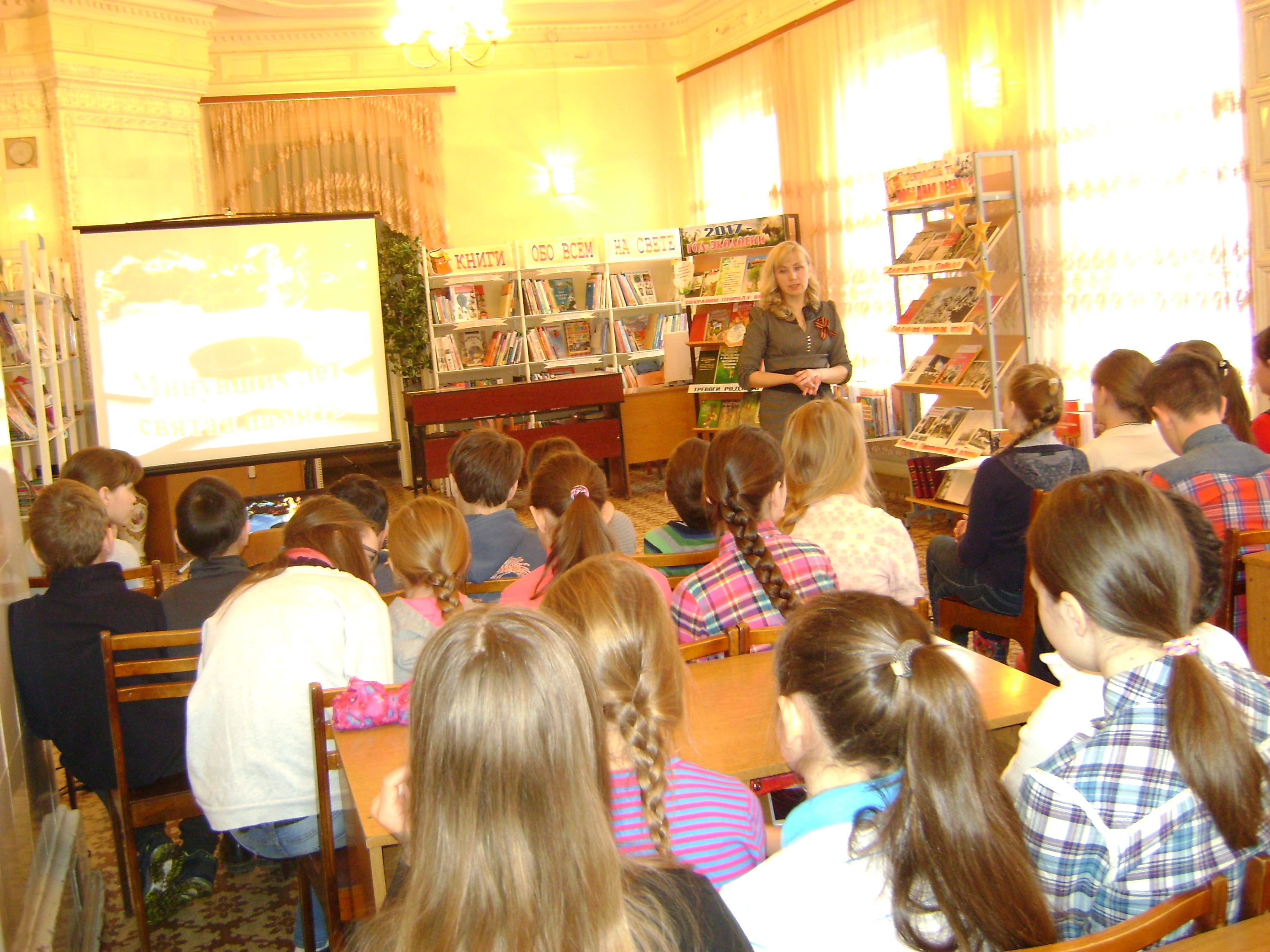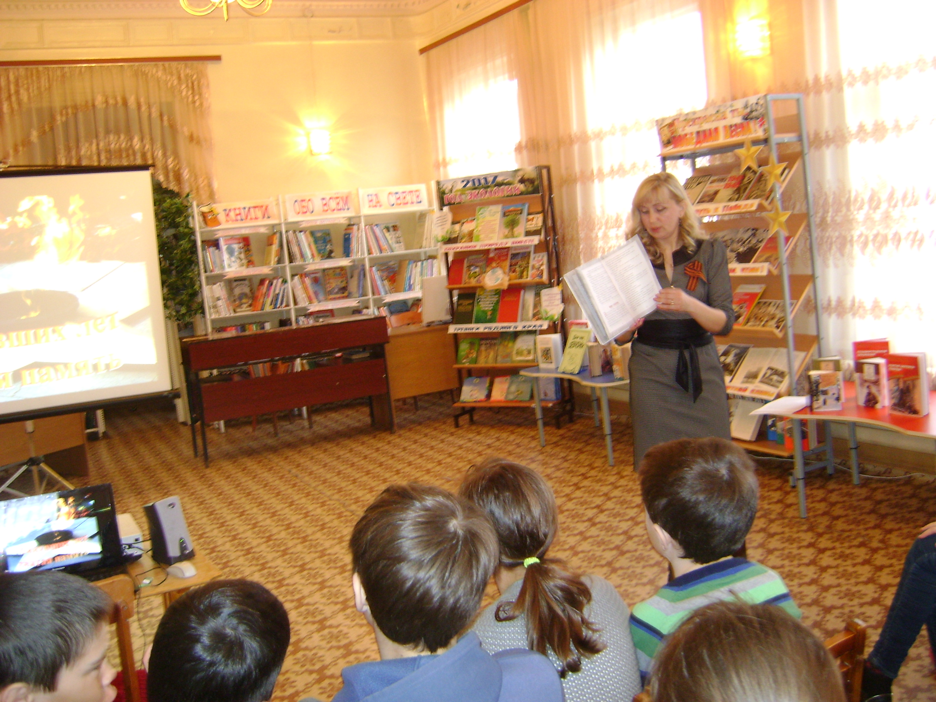 Школьники познакомились с творчеством писателя Сергея Алексеева, среди книг которого особое место занимают рассказы о Великой Отечественной войне. Главные битвы, рассказы о полководцах - маршалах Г.К. Жукове, К.К. Рокоссовском, героях на фронте и в тылу – все ключевые моменты этой войны отражены в книгах С.П. Алексеева. Заинтересовали ребят и такие книги, как «Жила-была…» И. Миксона, рассказывающая о ленинградской школьнице Тане Савичевой, пережившей блокаду; «Сын полка» В. Катаева; «Повесть о настоящем человеке» Б. Полевого.