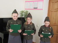 14 апреля 2016 года в ДШИ прошло мероприятие, посвящённое Победе в Великой Отечественной войне "Песни военных лет", целью которого было побуждение у учащихся интереса к песням Великой Отечественной войны. Ребята познакомились с историей появления песен "Вставай, страна огромная", " Вечер на рейде", "В землянке", "Катюша", "Синий платочек", "День победы", а так же с первыми их исполнителями. Мероприятие сопровождалось яркой презентацией и видео рядом, которые были подготовлены преподавателем Арютиной Д.Н., активное участие в мероприятие приняли учащиеся 1 класса музыкального отделения, а так же Шайдуллина Диляра, Мингазова Диана и Фомина Неонилла.