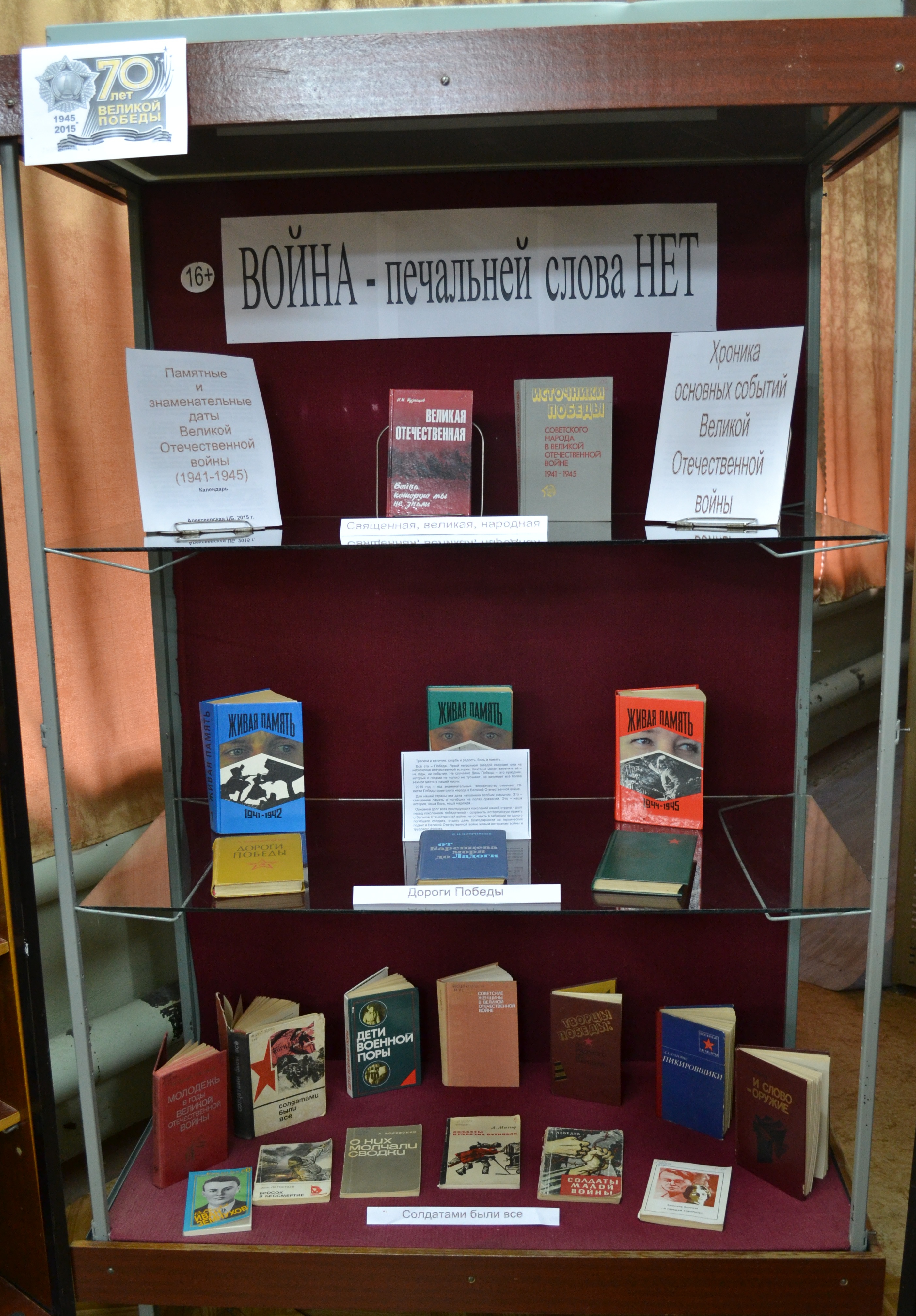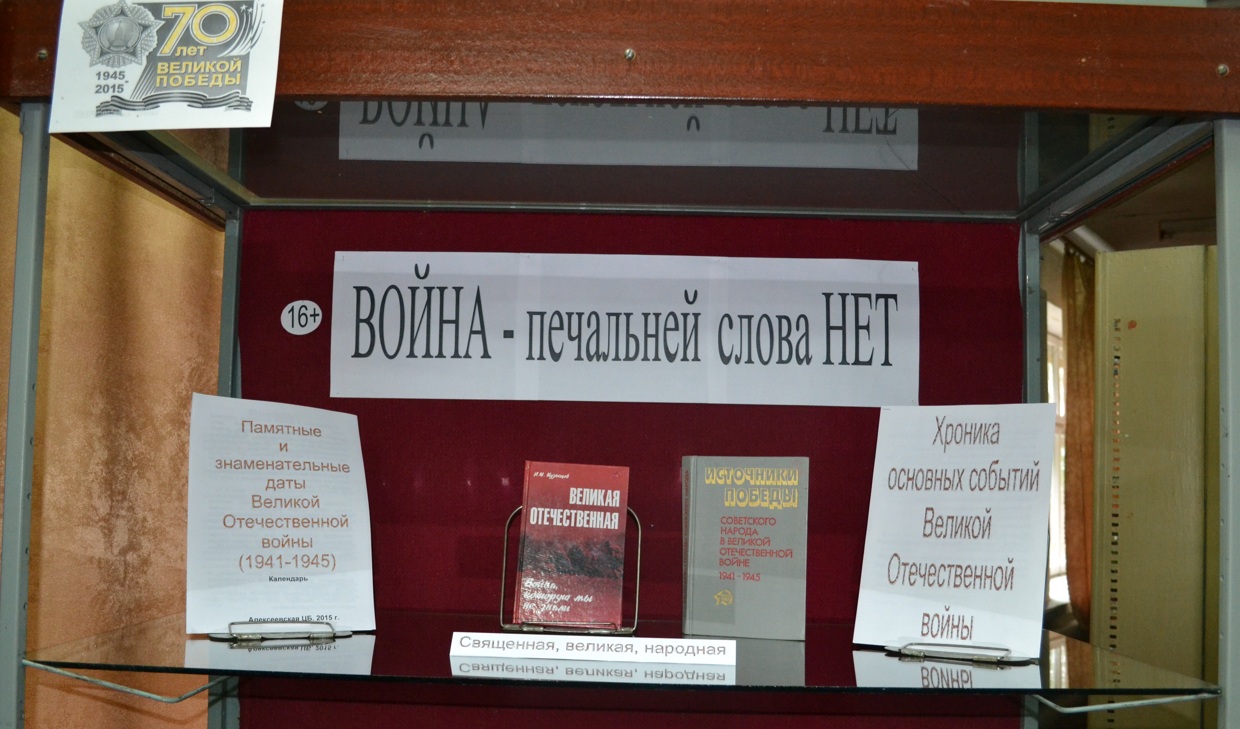 В Алексеевской центральной районной библиотеке постоянно действуют две выставки книг, посвящённых событиям Великой Отечественной войны. Библиотека обладает большим фондом данной литературы, и работники её всегда готовы помочь читателям найти нужную книгу, проконсультировать и порекомендовать.