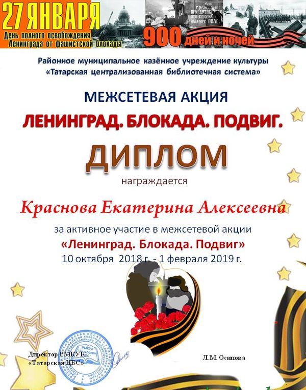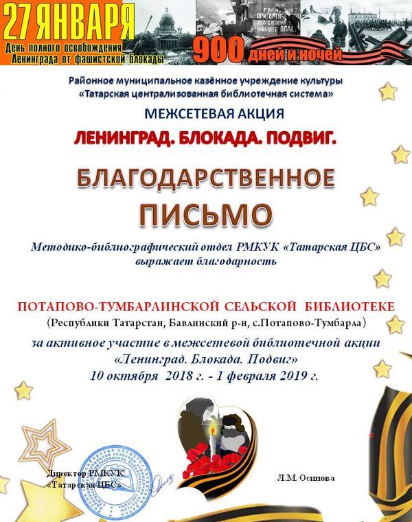 Потапово-Тумбарлинская сельская библиотека приняла участие в Межсетевой библиотечной акции «Ленинград. Блокада. Подвиг» Корпункт: Бавлинский Опубликовано 20 февраля, 2019 - 10:10 пользователем Петрова Снежана