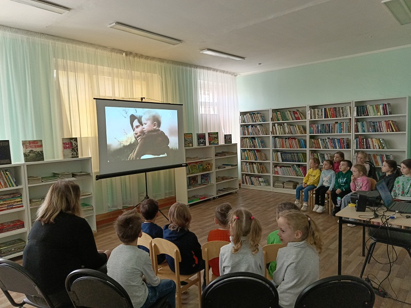 Ребята внимательно слушали истории подвигов Лёни Голикова, Зины Портновой, Вали Котика, Марата Казея, Вали Зенкиной – детей, получивших посмертно звание Героя Советская Союза. Для маленьких читателей были продемонстрированы видеокадры «Дети войны» и проведена викторина с загадками, в которых необходимо было угадать военные профессии. Завершилась встреча с ребятами исполнением песни о мире «Солнечный круг».