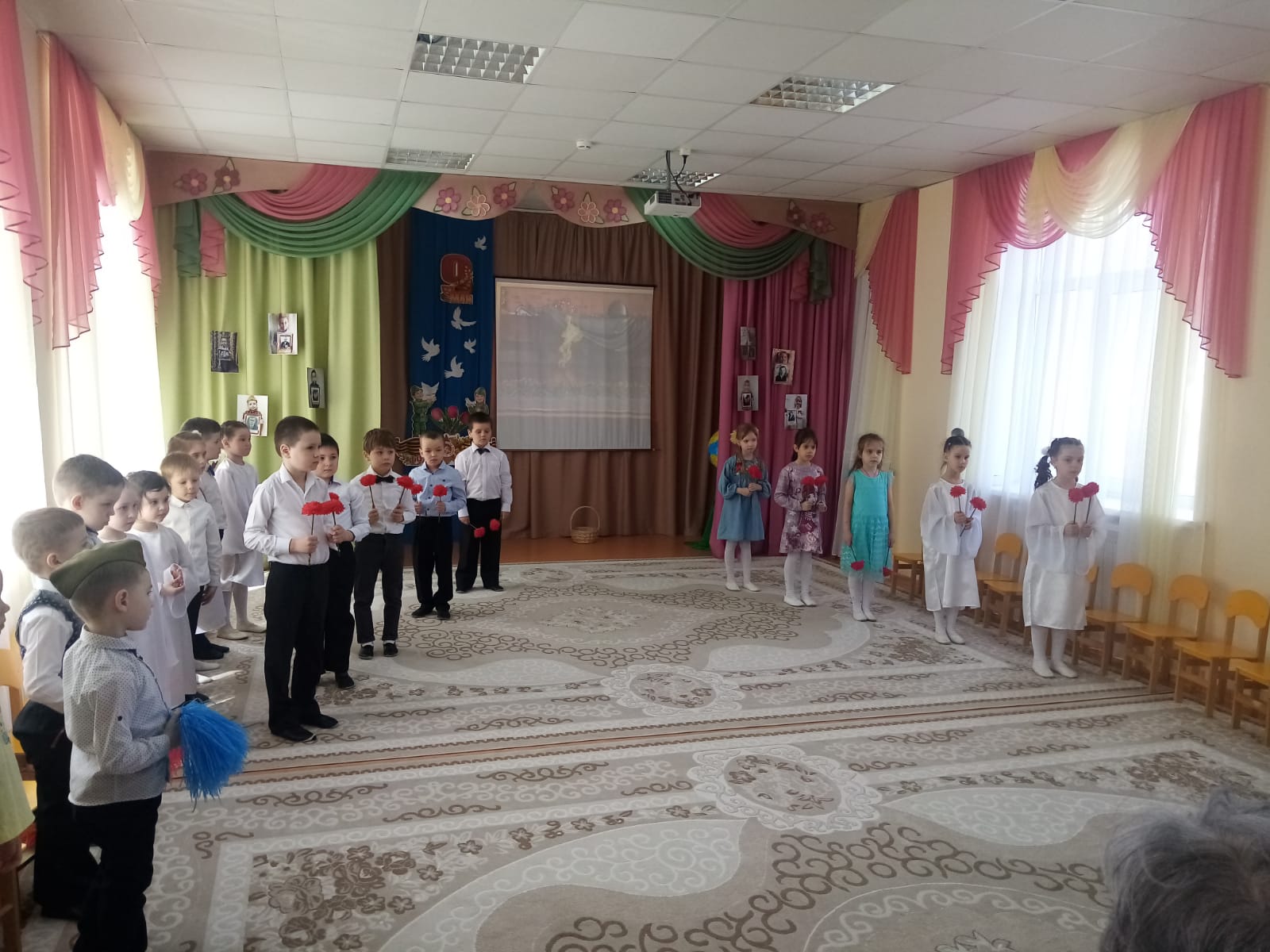 В преддверии празднования 77-летия Дня Победы в детском саду «Березка» города Тетюши прошёл праздник, с целью формирования у детей представления о подвиге нашего народа в годы Великой Отечественной войны, воспитания чувства гордости за принадлежность к своей стране. Гостями праздника стали участники хора ветеранов. Трофимова Валентина Алексеевна рассказала о трудном военном детстве. На празднике дети, с чувством особой благодарности читали стихи, исполняли песни, танцевали, почтили память погибших минутой молчания. Прекрасная проникновенная музыка песен военной тематики, вдохновенное исполнение ветеранами песен, стало восторженным составляющим праздника, внесло яркую ноту в это торжественное мероприятие. Воспитанники подготовительной группы подарили ветеранам открытки, сделанные своими руками.