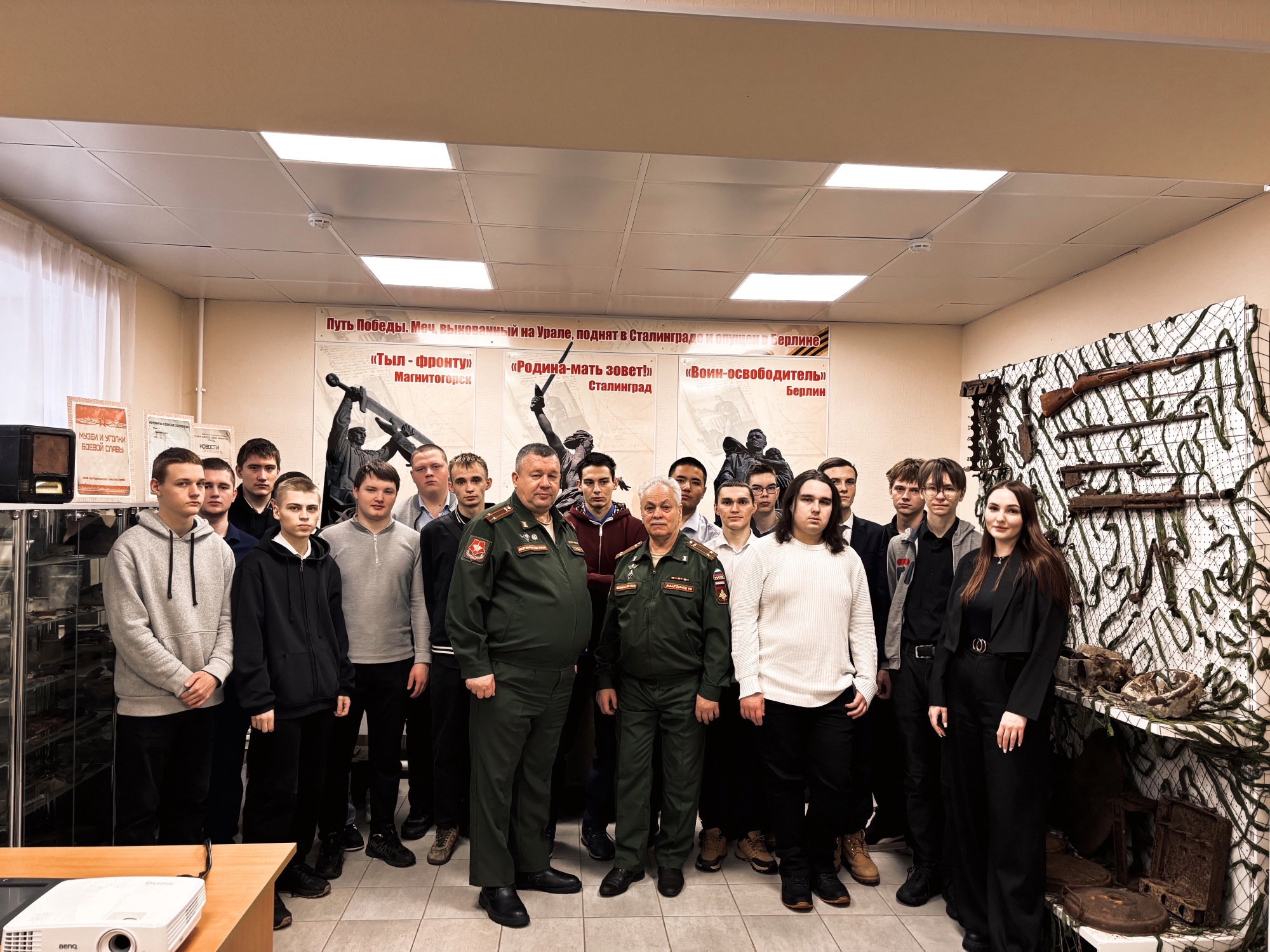 20 декабря сотрудники зонального центра военно-патриотического воспитания «Патриот» провели экскурсию для студентов. В мероприятии приняли участие 16 учащихся группы 31 СЛП Альметьевского профессионального колледжа, для которых оно стало настоящим погружением в события Великой Отечественной войны. Подполковники запаса Рафис Раисович Ямалтдинов и Павел Владимирович Тазин рассказали студентам о подвигах советской армии, героизме солдат и о