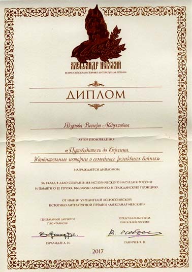 Специальный диплом за вклад в дело сохранения исторического наследия России и памяти о ее героях, высокую духовную и гражданскую позицию получила и главный редактор газеты «Казанские ведомости» Венера Якупова, являющаяся автором-составителем книги «Путеводитель до Берлина. Удивительные истории о семейных реликвиях войны» (2-е издание), увидевшей свет весной этого года.