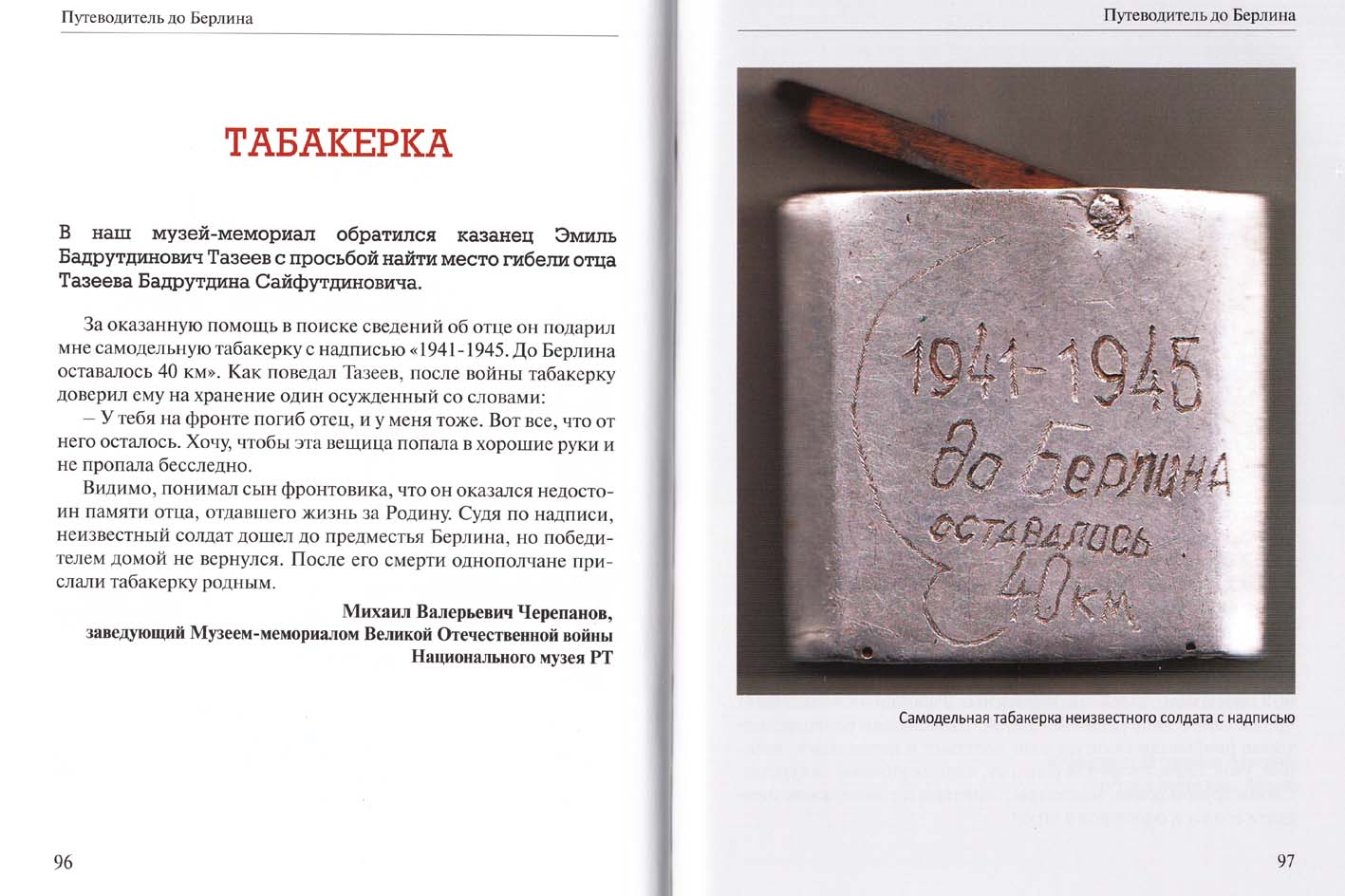 Многие читатели "Казанских ведомостей" имеют непосредственное отношение к книге - в ее основу легли истории, опубликованные на страницах газеты в рубрике «История войны в вещах» в течение 2015 - 2017 годов. Читатели делились воспоминаниями о своих родственниках - участниках войны и семейных реликвиях военного времени, передаваемых из поколения в поколение татарстанцами. Благодаря вышедшему «Путеводителю до Берлина» о подвигах героев узнали не только в нашей республике, но и во всей России.