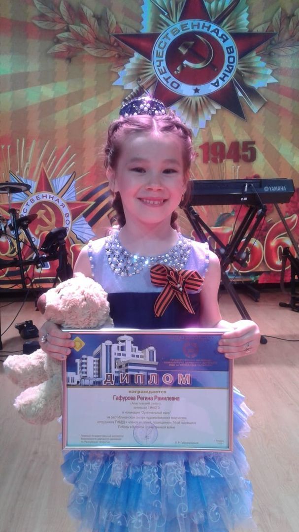 В праздничном концерте приняли участие ветераны Великой Отечественной войны, сотрудники Госавтоинспекции и организаций, задействованных в сфере обеспечения безопасности дорожного движения и члены их семей. Также в рамках подготовки к 74-ей годовщине Победы в Великой Отечественной войне провели республиканский смотр конкурс художественного творчества среди сотрудников, ветеранов подразделений ГИБДД У(О)МВД России по городским округам и муниципальным районам Республики Татарстан и членов их семей. От имени Апастовского района выступила дочь сотрудника ГИБДД Регина Гафурова (6 лет) в номинации "Оригинальный жанр". Она рассказала стихотворение "Юлыгыз һәрчак уңсын!". Регина Гафурова успешно прошла зональный тур и финал смотра и заняла первое место. Награждение победителей прошло в рамках праздничного концерта. Регине вручили диплом и денежное вознограждение.
