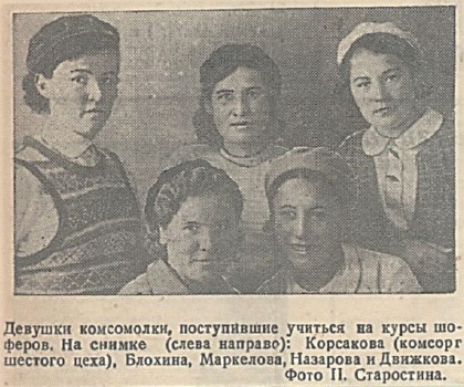 В октябре 1941 года начали работать женские курсы шоферов. Несколько десятков девушек и молодых женщин, преимущественно комсомолок, патриоток своей Родины, без отрыва от производства будут готовить себя для сложной, почетной и вполне посильной работе на машине. Они будут готовить себя для того, чтобы заменить шоферов-мужчин, ушедших на фронт, и тем самым ковать победу над врагом.