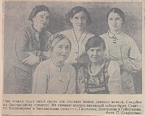 Большое количество рабочих нашего завода вступили в ряды доноров и регулярно сдают кровь для спасения жизни раненых бойцов, командиров и политработников Красной Армии. Доноры только трех цехов (ремонтно-механические мастерские, третий и пятый цеха) сдали за время войны с германскими захватчиками свыше 33 000 грамм крови. Тов. Шубина и Спирягина сдали по 68о грамм крови каждая, т. Дергунова сдала 910 грамм.