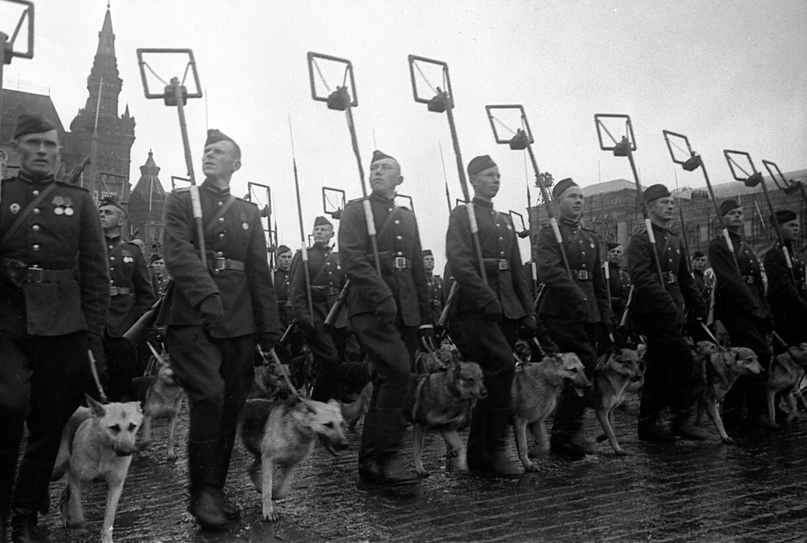 Всего же за годы Великой Отечественной войны со всей страны в армию было направлено около 68 тысяч собак. На фотографии - саперы с собаками минно-розыскной службы на Параде Победы 24 июня 1945 года. Вполне возможно, что среди них есть и четвероногие бойцы из Татарстана.