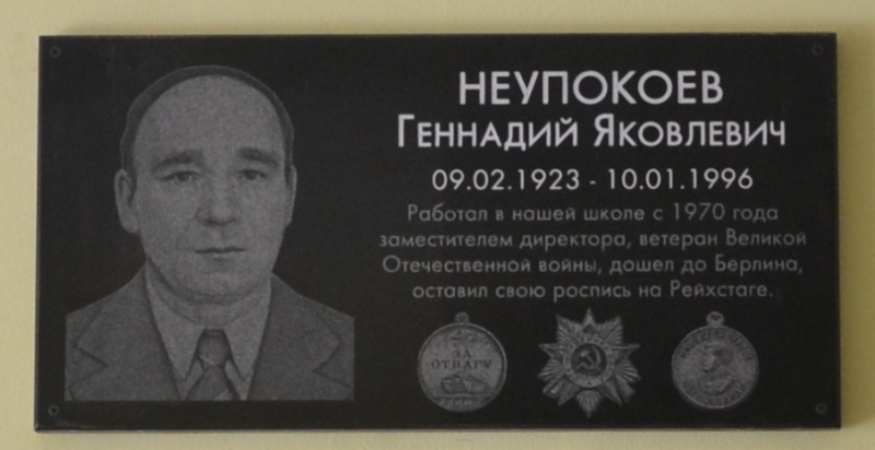 В школе №4 состоялось торжественное открытие мемориальной доски, посвященной Геннадию Неупокоеву. Геннадий Яковлевич Неупокоев - учитель железнодорожной школы №4 станции Агрыз, в Великую Отечественную войну был командиром противотанкового взвода. Он прошел боевой путь до Берлина и расписался на Рейхстаге. После войны Геннадий Яковлевич вернулся в родную школу. Заочно окончил Кировский пединститут, работал заведующим РОНО. А с 1970 года – завучем в Агрызской школе-интернате. Среди приглашенных гостей были те, кому посчастливилось работать с героем, жить рядом с ним.