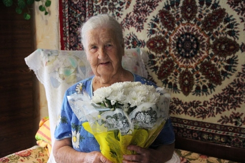 Юбилярше вручили поздравительные открытки Президента Российской Федерации Владимира Путина, главы района, а также продуктовый набор, цветы.