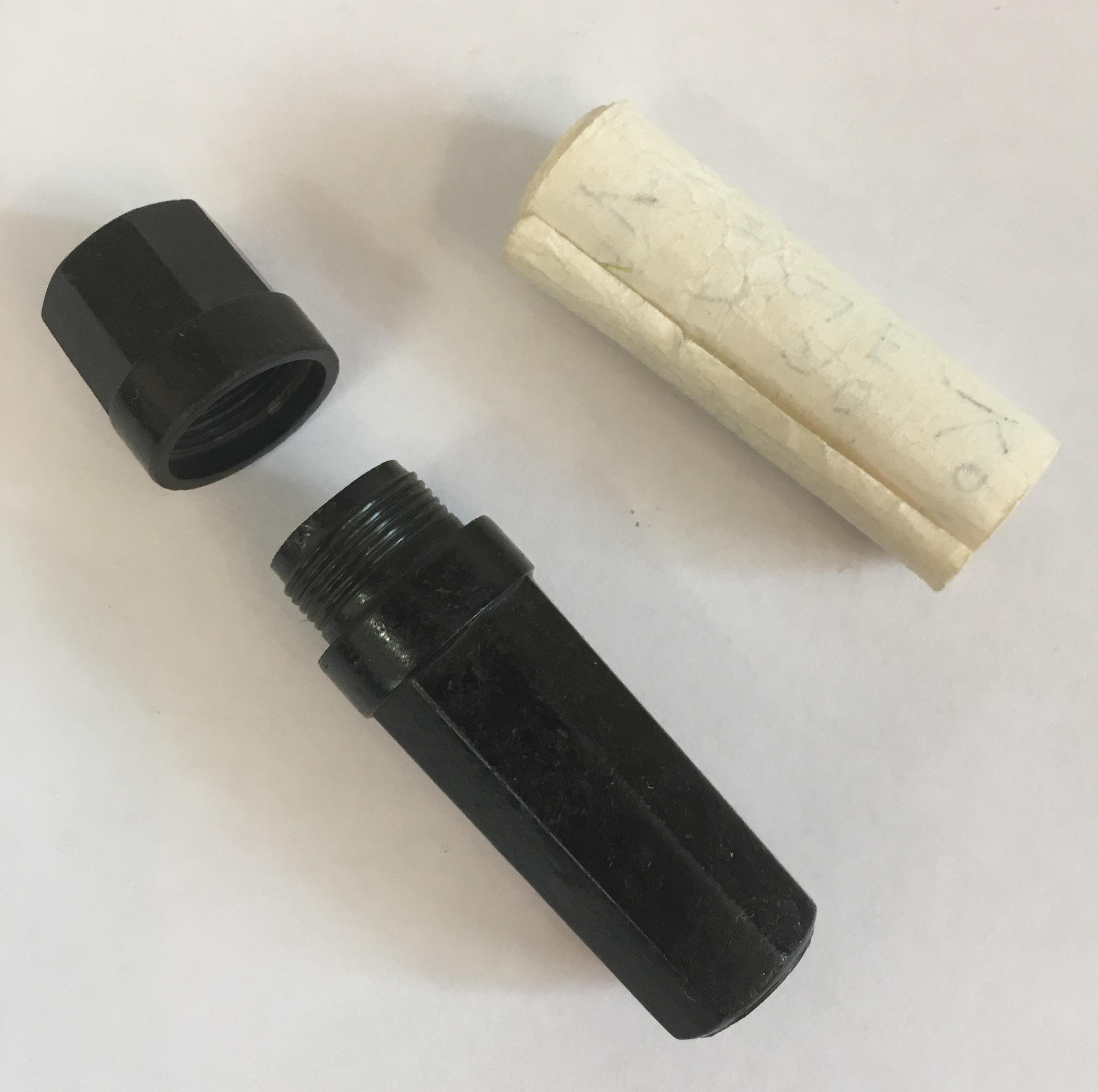 Капсула выполнена из черной пластмассы и состоит из корпуса и крышки, имеющие между собой резьбовое соединение. Длина медальона 50мм. В полости медальона находился бумажный вкладыш установленного образца.
