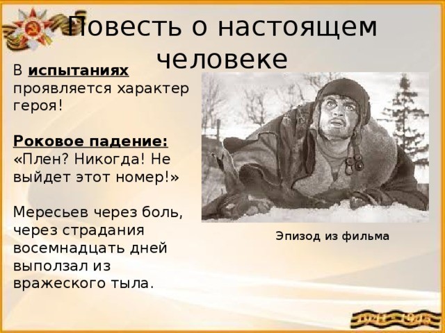 Главный герой повести - молодой советский летчик-истребитель Алексей Мересьев. Однажды в бою фашисты подбивают самолет Алексея. Истребитель падает где-то в лесу в глубинке России. Алексей чудом выживает, но его стопы сильно повреждены. Алексей 18 дней ползет по лесу, чтобы не попасть в немецкий плен. Наконец Алексея подбирают местные жители. Через неделю начальство присылает за Алексеем самолет. Его увозят в госпиталь в Москву.