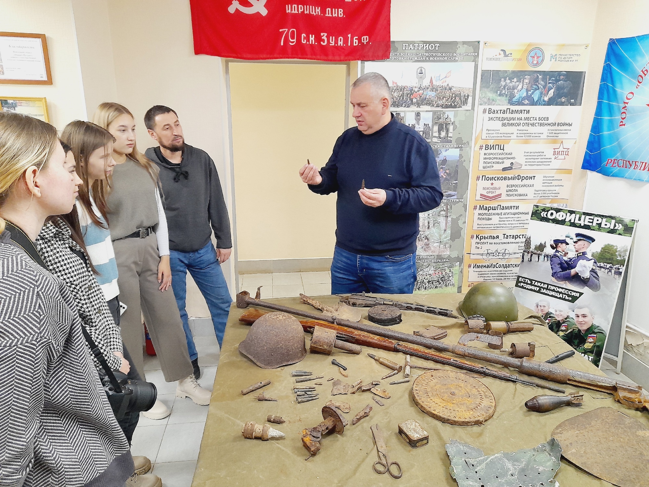 Экскурсию провел Евгений Еланский, заведующий молодежного (подросткового) клуба «Патриот»и руководитель поискового отряда «Ветеран». Оноживленно рассказывал о каждом экспонате, подробно объясняя их применение и значение для солдат. Студенты получили возможность прикоснуться к настоящим артефактам военного времени: винтовкам, гранатам, каскам.