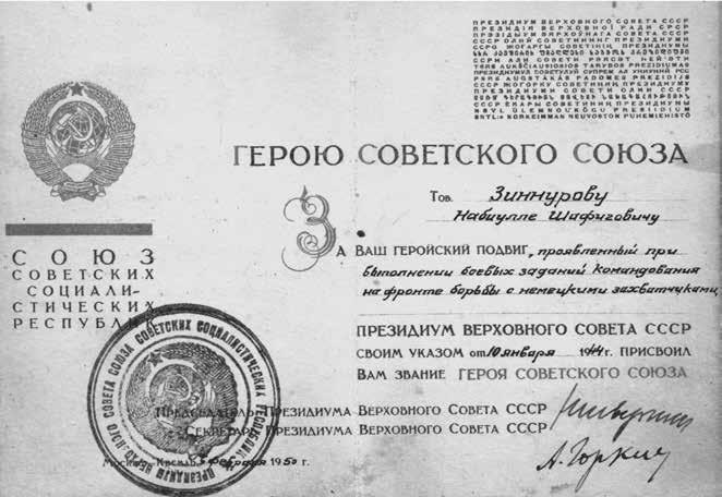 трудности». Отец Ваш оказался – человек-душа. Из рассказов сослуживцев и его биографии я узнал, что Набиулла Шафигович с 22-го года - выглядел он даже моложе… - что сельский парень из Татарии, из деревни с непривычным моему уху названием Маматкозино. А что он успел до войны поработать, несмотря на молодость, и без рассказов было видно по его рабоче-крестьянской хватке. В колхозе, на ватной фабрике в Казани, даже председателем сельпо работал. Это – должность! Ее не каждому бывалому доверят… Что удивительно, ведь совсем гражданский человек, а как военное дело знал! Школа полковая, конечно, дала ему много. Но, чтобы так воевать, без таланта невозможно. Из прифронтового села, где мы встретились, вскоре перешли на передовую линию фронта – сменили одну из дивизий. Это было приблизительно 1 июня 1944 года. То есть, через полгода после того, как он стал Героем Советского Союза. На передовой мы с отцом и еще одним товарищем – комсоргом батальона москвичом Зайцевым - находились в одной землянке, спали на одной постели,… была такая, «трехместная». Каждую ночь ходили на передовую к солдатам. Беседовали почти с каждым, а наутро возвращались в штаб, в свою землянку. Мало-помалу от старых солдат, прошедших в составе полка и батальона Курскую битву, Украину, и от Зайцева я узнал, что Зиннуров тоже недавно был комсоргом. Многие тогда перед боем – кто устно, кто письменно – заявляли «прошу считать меня комсомольцем или коммунистом». Да, им было, что вспомнить…