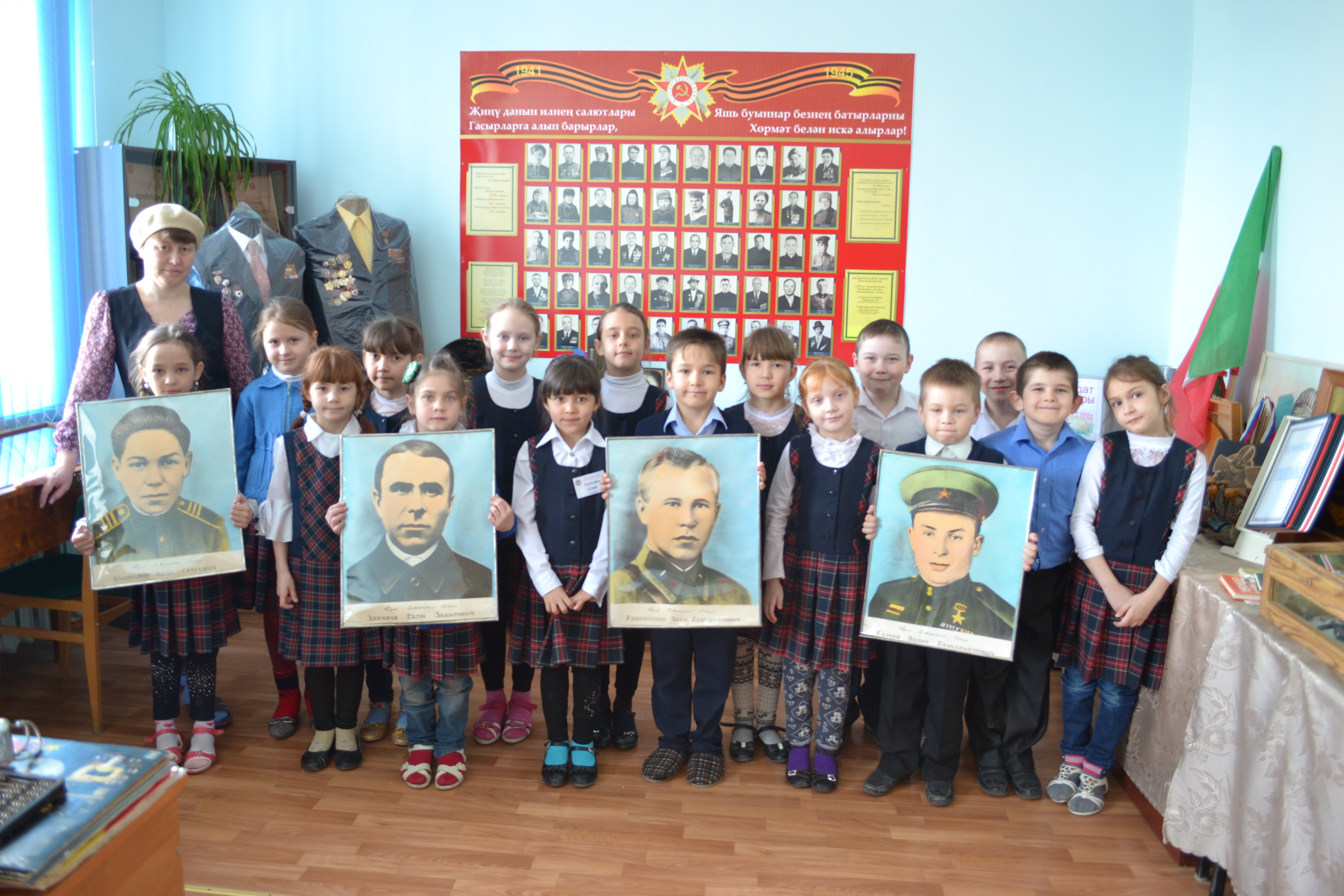 Сотрудники музея познакомила учащихся с подлинными экспонатами военной тематики. Наибольший интерес у гостей музея вызвали: коллекция солдатских писем и фотографий; личные вещи кавалера трех степеней ордена Славы снайпера Абдуллы Мотыйгуллина и Героя Советского Союза, Вали Хазиева; подшивка Красноармейской газеты Калининского фронта 1942-1943 гг. «Алга дошман остенэ» («Вперед на врага») и другие экспонаты.