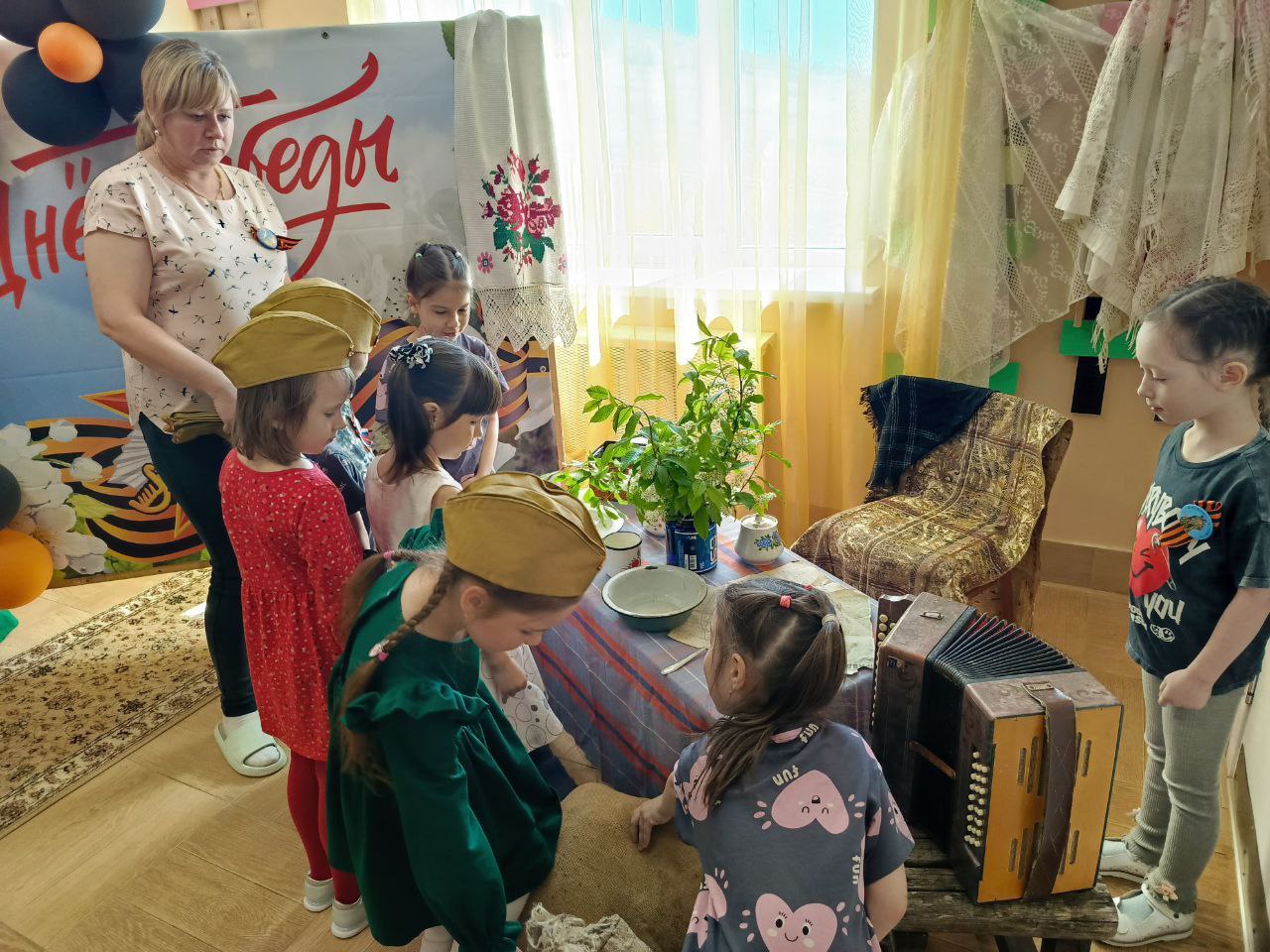 Сегодня в ДОУ №15 прошло тематическое занятие, посвященное 80-летию Великой Победы. Проведена беседа о событиях и героях Великой Отечественной войны. Детки рассмотрели посуду и другие предметы быта военного времени.