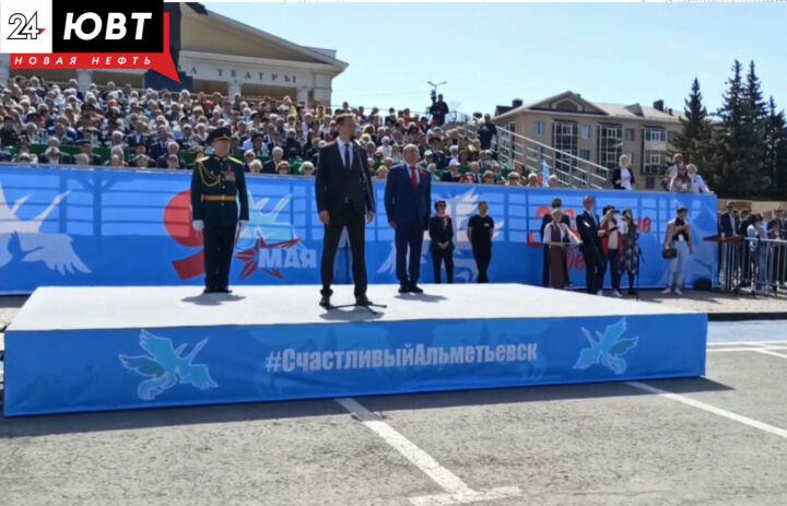В Альметьевске на площади Ленина проходит торжественный парад. На мероприятии выступил глава Альметьевского района Тимур Нагуманов.