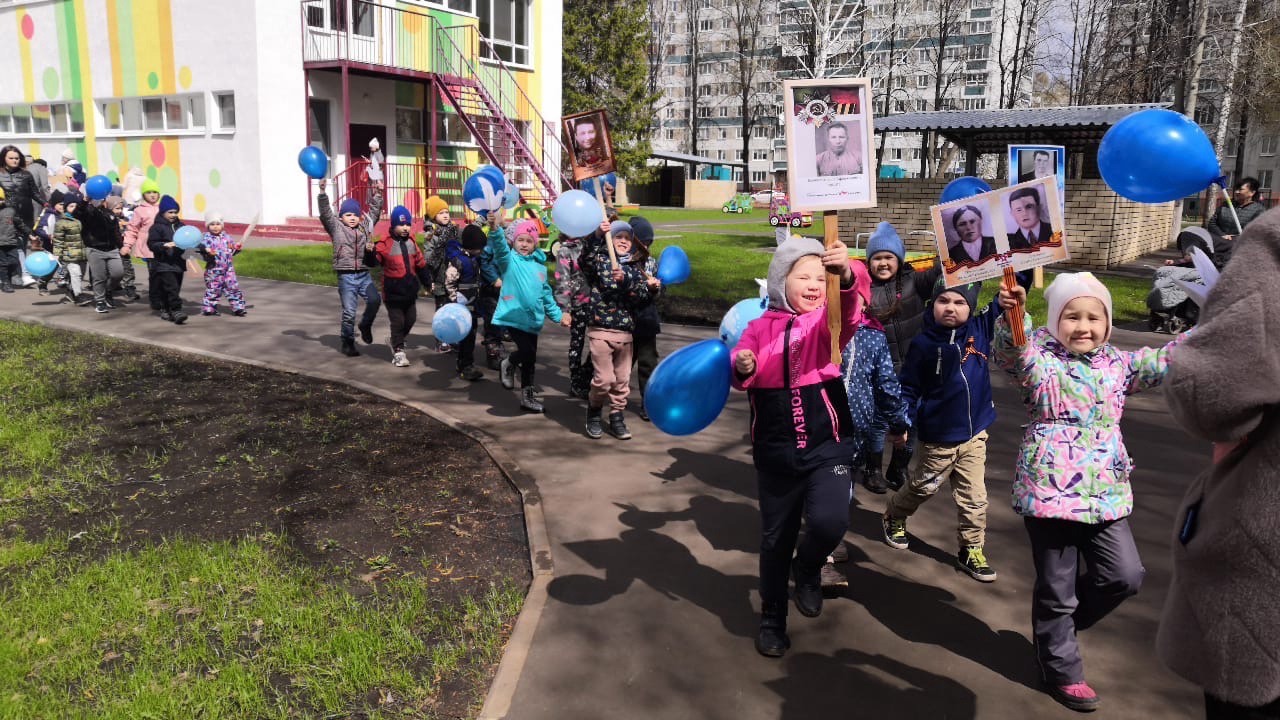 Торжественное мероприятие, посвящённое дню Победы, прошло на территории детского сада №79 "Вишенка". Дети спели несколько песен о войне, читали красивые стихотворения, почтили героев минутой молчания, прошли круг почёта с портретами ветеранов Великой Отечественной войны, с цветами, шарами, голубями.