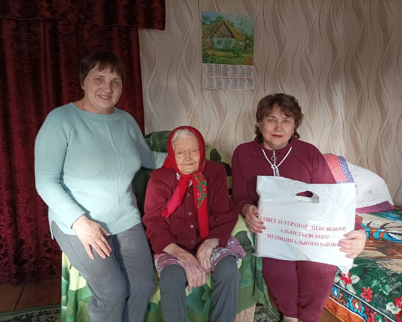 От имени Главы Кичуйского сельского поселения Тумановой Г. П., председателя Совета ветеранов Альметьевского муниципального района Яшанина В. И., труженицу тыла сотрудники Кичуйского сельского Дома культуры. Пожелали ей доброго здоровья и вручили подарки.