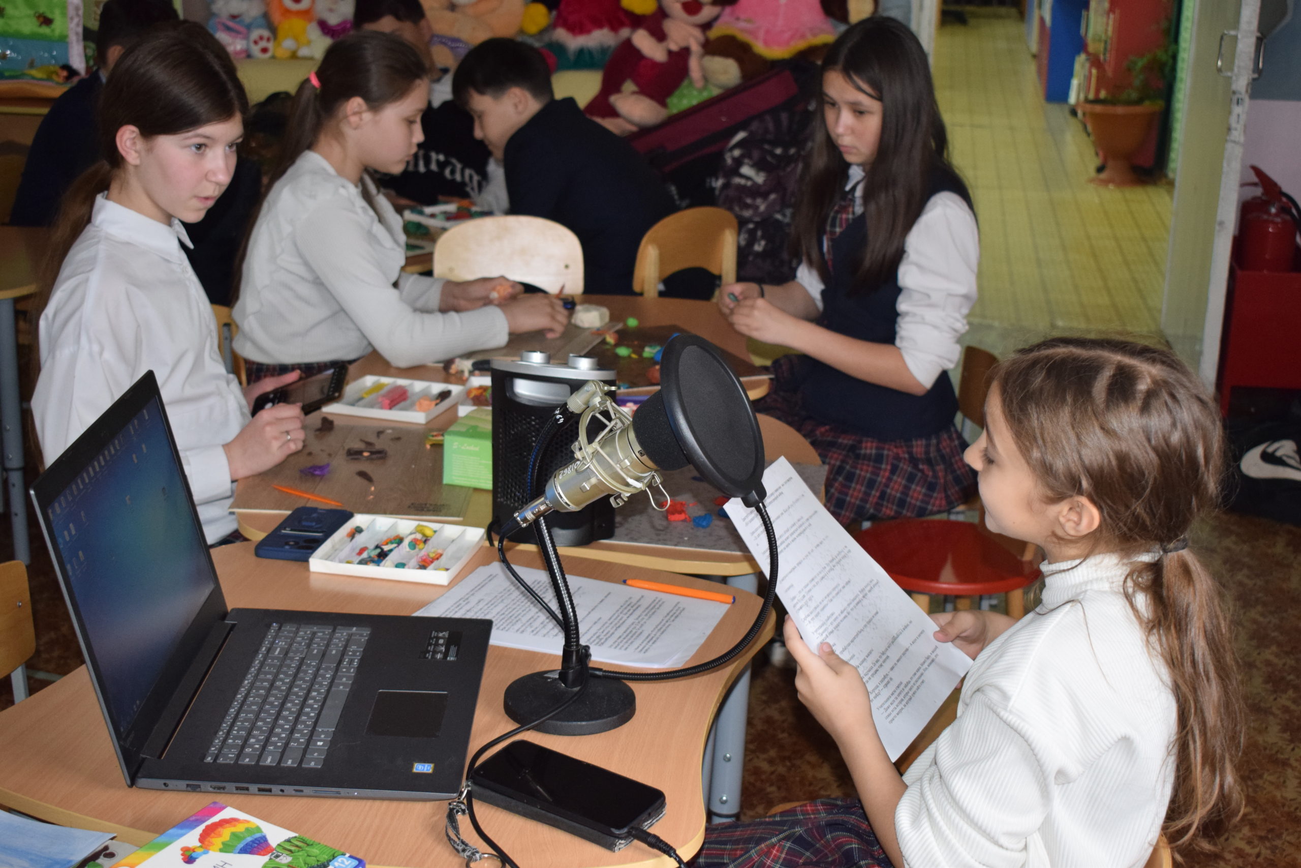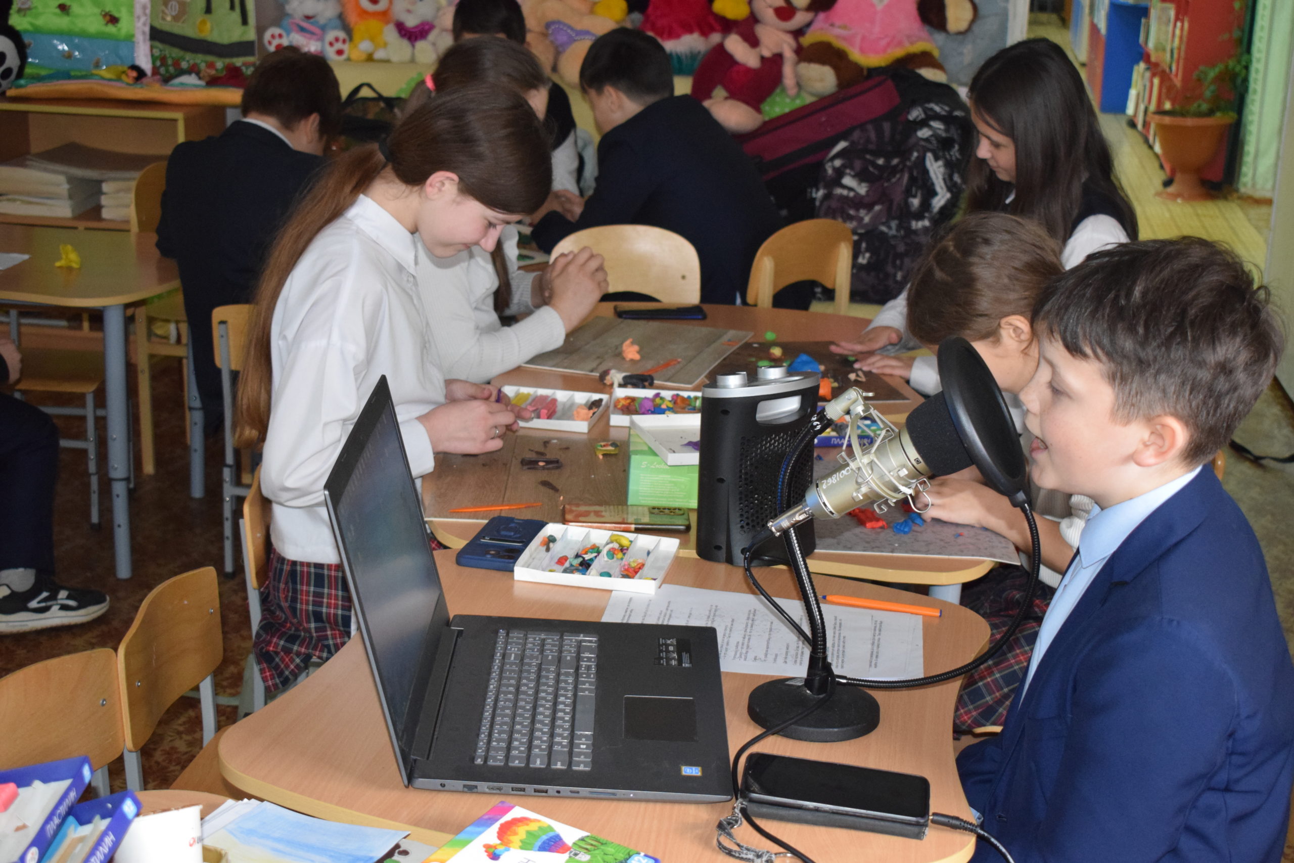 В детской анимационной студии «ПоЧиТаШкИ» при центральной детской библиотеки Бугульмы студийцы продолжают работу над короткометражным мультфильмом, посвященном 80- летию Победы. Юные мультипликаторы приступили к самому ответственному этапу создания своего мультфильма – монтажу и озвучке. Руководитель студии напомнила ребятам о том, какое оборудование используется для записи, показала, как правильно пользоваться микрофоном, и на протяжении всего процесса записи озвучки подбадривала ребят и помогала советами.