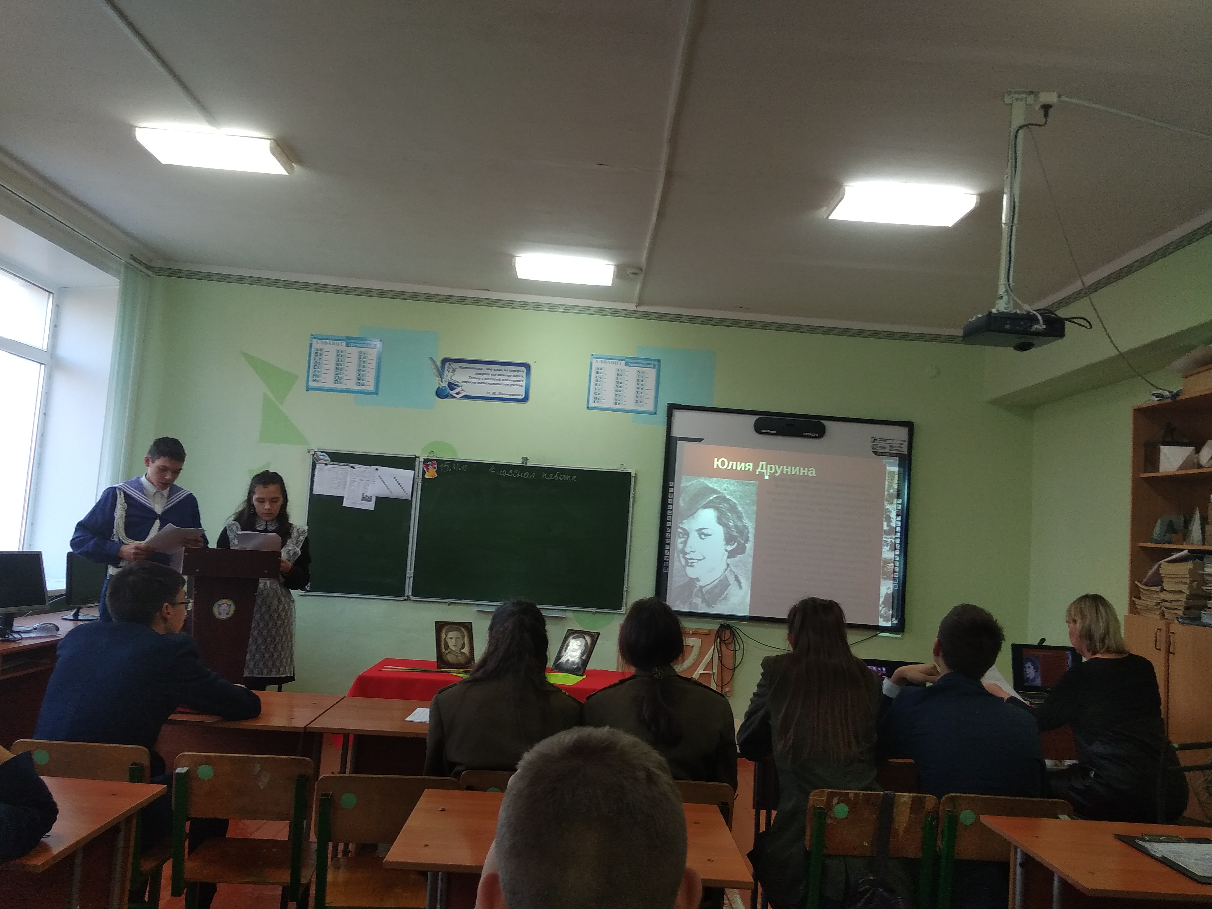 Учащиеся читали стихотворения Ю.Друниной: "Я ушла из детства в грязную теплушку", "Зинка". Участники мероприятия все вместе исполнили знаменитую песню К. Шульженко "Синий платочек", "Родина-мать зовет".
