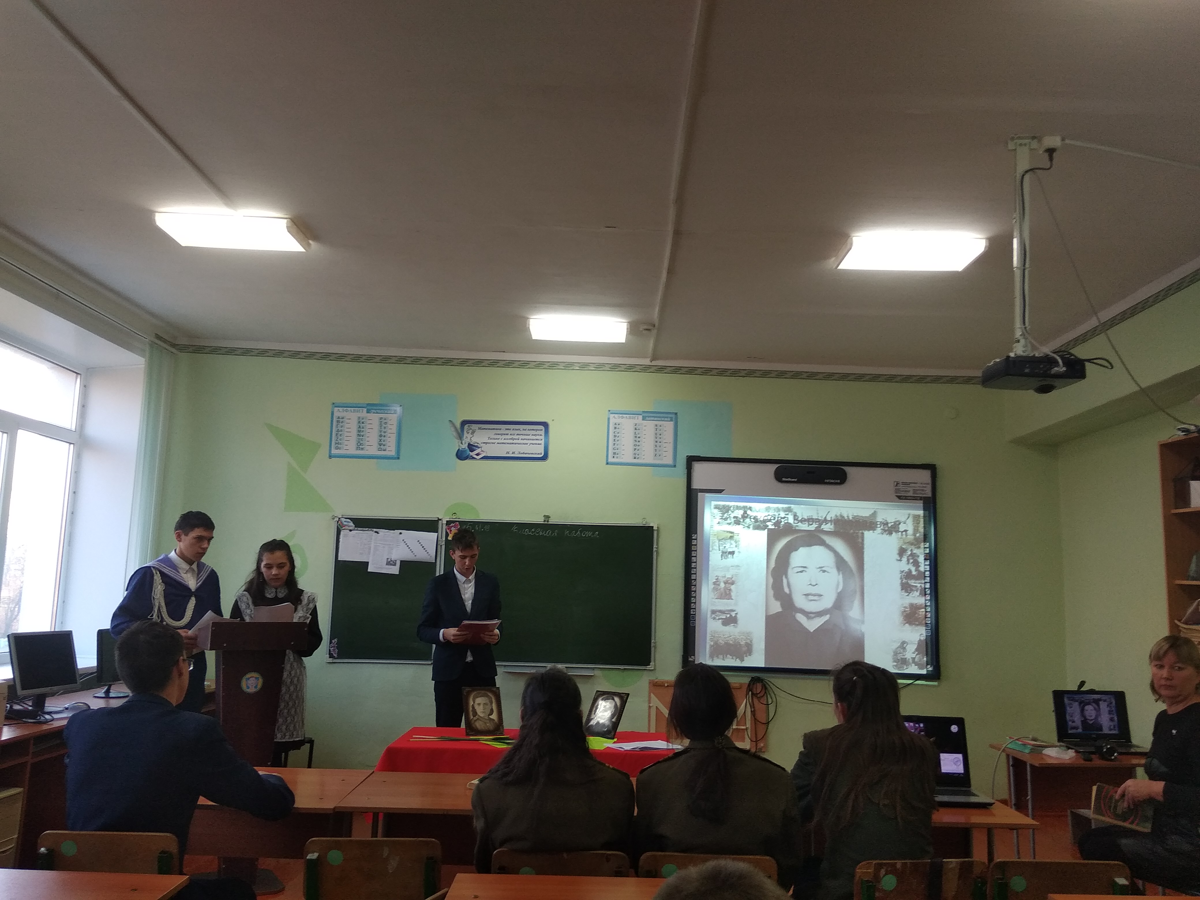 В рамках подготовки к празднованию 75-летия Победы в Великой Отечественной войне учащиеся 10 класса МБОУ «Большетарханская СОШ» под руководством классного руководителя Савельчевой Л.С. подготовили и провели классный час «У войны не женское лицо». На самой страшной войне ХХ века женщине пришлось стать солдатом. Она не только спасала, перевязывала раненых, но и стреляла, подрывала мосты, ходила в разведку. Егоров С. рассказал о боевом пути своей бабушки Рекеевой (Егоровой) В.Н. – ветерана ВОв, ветерана труда, педагога Большетарханской средней школы. Вера Николаевна была связистом, охраняла правительственную связь. Воевала и на Курской дуге. Победу встретила в Будапеште. Имеет награды, среди них Орден Отечественной войны.