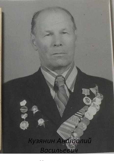 Сын Анатолий воевал штурманом с 1.08. 44 г. по 9.05. 45 г. на бомбардировщике в 229 гв. бап. 14 гв. бад. Совершил 15 успешных боевых вылетов ночью на бомбардировщике Б-25 по разгрому железнодорожных узлов, промышленных объектов, живой силы и техники противника. Летал на цели Галац, Данциг, Хелев, Бреслау, Сату-Маре, Маравска- Острава и др. Имеет общий налёт 225 часов, из них ночью 57 часов. За время пребывания в полку не имел случаев потери ориентировки, всегда точно и в срок приводил самолёт к цели, метко её поражал и благополучно возвращался на свой аэродром. Демобилизовался в сентябре 1959 года. Майор Кузянин Анатолий Васильевич за свой ратный труд награждён Орденом Ленина, Орденом Красной Звезды, Орденом Красного Знамени, медалями "За боевые заслуги", "За взятие Берлина", "За победу над Германией 1941-1945 г."