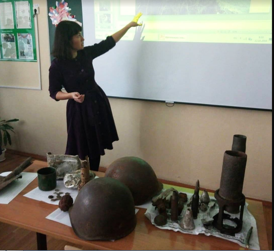 Урок получился содержательным и эмоциональным. Гостьи школы №7 рассказали ребятам о поисковом движении, полевых экспедициях в разных регионах страны – Ленинградской, Тверской, Мурманской областях, Республике Беларусь, показали фотографии раскопок, а также артефакты Великой Отечественной войны, привезённые с мест сражений. На мини-выставке можно было увидеть такие экспонаты, как ложка, котелок, кружка, фляжка, каска, сапёрная лопата, части гранат, сигнальной ракеты и другое.