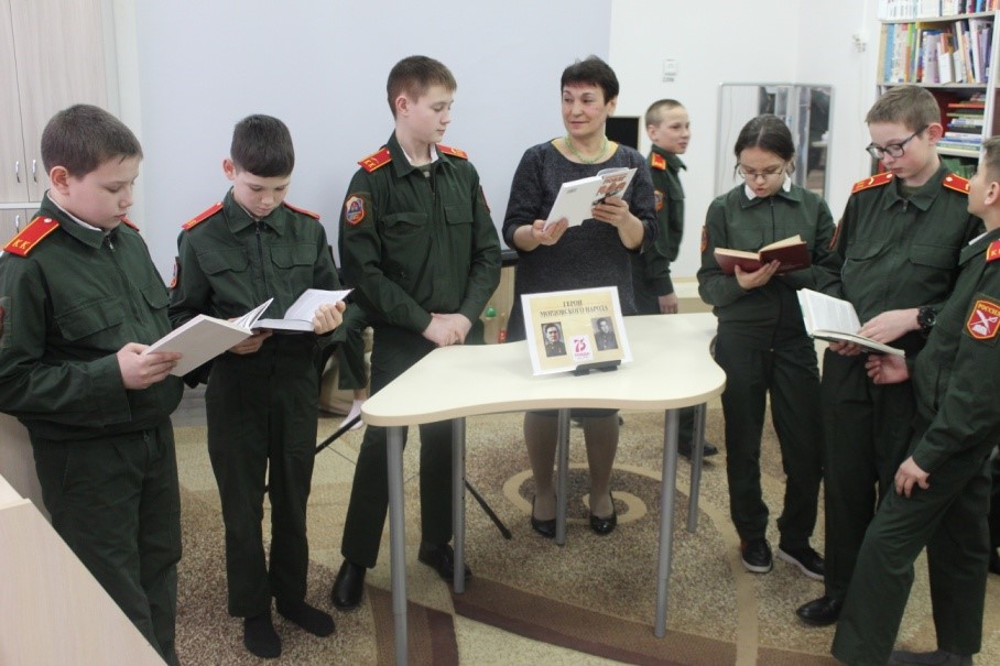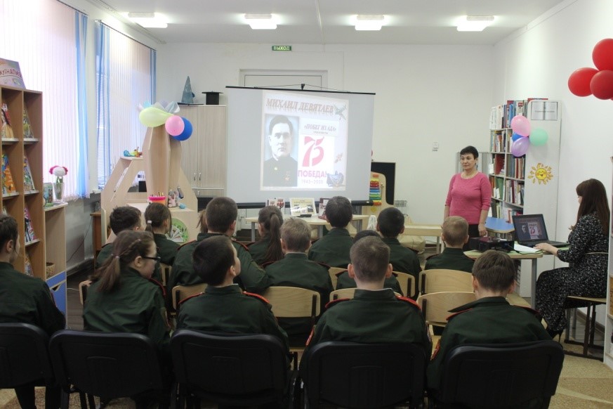 К 75- летию Великой Победы в Центральной детской библиотеке села Черемшан с учащимися Черемшанской кадетской школы-интерната прошел урок мужества «Герои мордовского народа». Имена этих легендарных летчиков, Героев Советского Союза известны всему миру из книг «Побег из ада» (о Михаиле Девятаеве) и «Настоящий человек Алексей Маресьев» Ребята узнали, как в годы Великой Отечественной войны в немецком плену Девятаев с группой товарищей захватил фашистский самолет и улетел на нем из острова смерти. Подвиг Алексея Маресьева - надежда и пример для многих людей, напоминает нам, чего может добиться тот, кто не утратил силы бороться и веру в себя. Потеряв на фронте обе ноги, он не сломался, а прошел по жизни настоящим человеком. Его подвиг вдохновил Бориса Полевого на создание знаменитой книги «Повесть о настоящем человеке», где Маресьев выступил прообразом главного героя. Мероприятие сопровождались показом электронной презентации. На книжной выставке были представлены книги М. Девятаева и Б.Полевого.