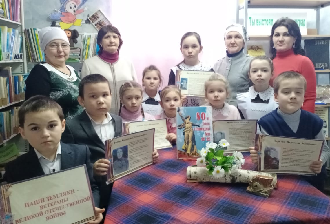 Библиотекарь Хайруллина З.И. рассказала детям о значимости этого события. В ходе беседы ребята узнали о земляках, которые участвовали в этой битве. Познакомились с папкой-накопителем «Жизненный путь и подвиг земляков Сталинградской битвы», с книгой В. Зайцева «За Волгой земли для нас не было». Узнали о мужестве, стойкости и самоотверженности нашего народа.