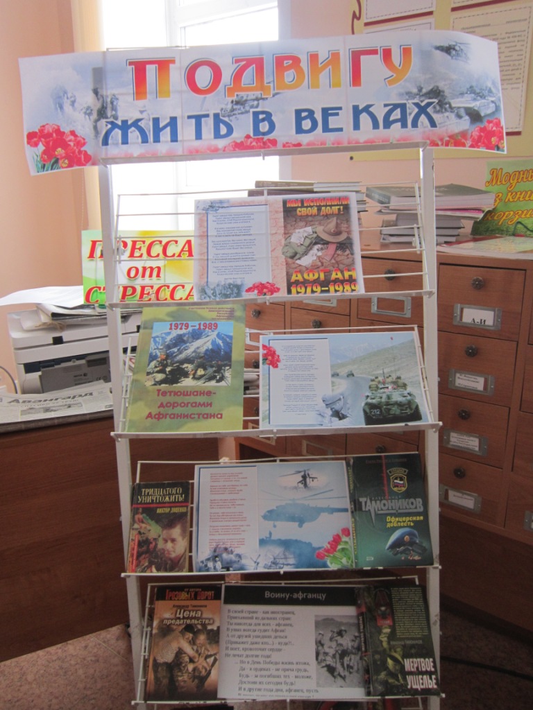 На мероприятии были прочитаны стихи о войне, прослушаны песни. Затем рассказала о земляках, которые участвовали в Афганской войне. В конце мероприятия был проведен обзор книжной выставки «Подвигу жить в веках». По окончании встречи была объявлена минута молчания в память о тех, кто не вернулся с той страшной войны.
