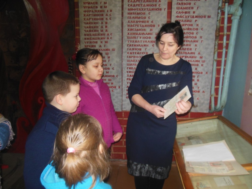 Наш односельчанин - Галимзян Шарипов - участвовал в этом бою, за что был награжден медалью «За оборону Сталинграда», неоднократно получал Благодарность от товарища Сталина. Подлинные документы хранятся в музее, с которыми тоже библиотекарь ознакомила ребят. Также в музее хранится ком земли, взятый с Мамаева кургана. Его привезла из Волгограда группа учеников, побывавших в городе – герое еще в 1985 году. В составе группы была и библиотекарь - Галимова Гульчачак. Она рассказала присутствующим о памятных местах города. Её рассказ дополнили педагоги Хамидуллина Гульшат и Амерханова Румия.