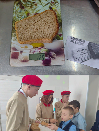 В рамках акции прошел урок памяти «Блокадный хлеб», на котором учащимся рассказали о блокаде Ленинграда, поделились с ними важными историческими фактами, связанными с блокадным хлебом, жизнью блокадников. Актив школы и юнармейцы выдали школьникам и учителям карточки, по которым в столовой выдавали те, заветные 125 грамм хлеба.