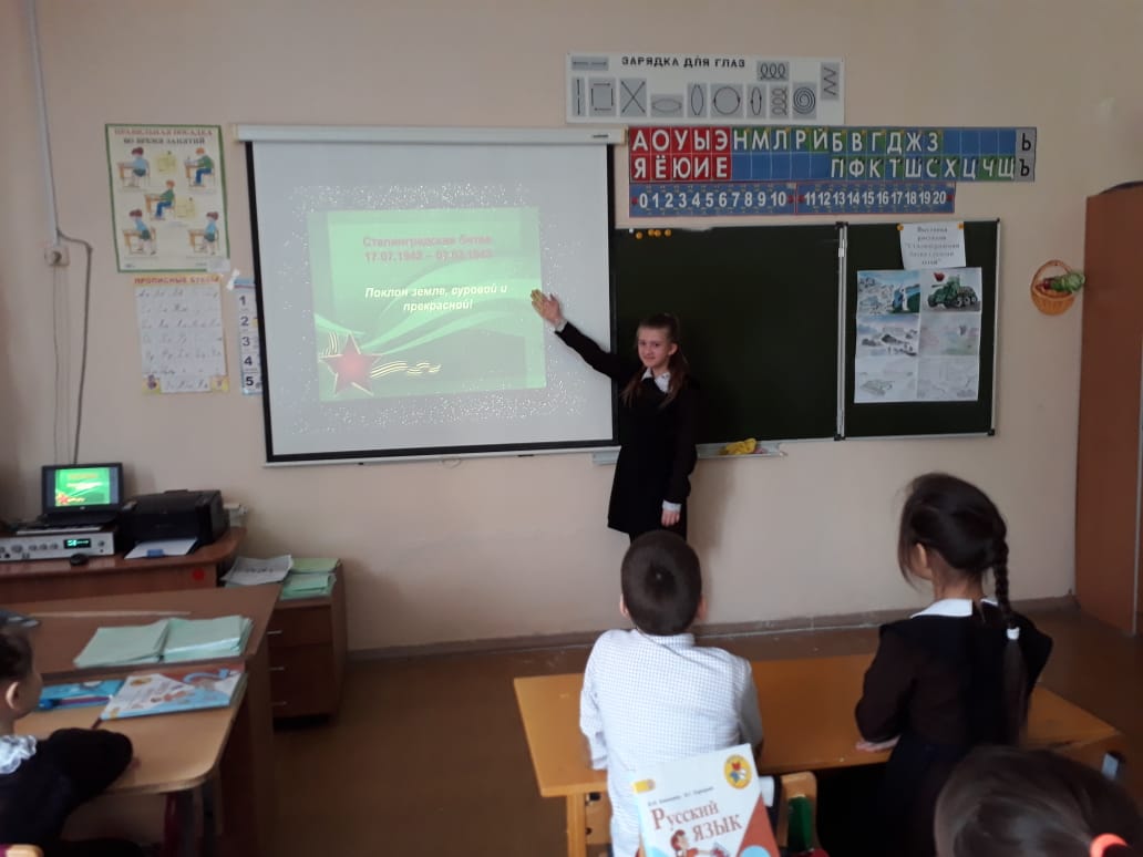 К 77-летию Сталинградской битвы в СОШ №33 прошел урок памяти «Герои Сталинградской битвы» во 2 В классе. В рассказе о Сталинградской битве — самой знаменитой битве Второй мировой войны, ставшей переломной на Восточном фронте, внимание школьников было акцентировано на мужестве и героизме советских воинов, включая детей, которые ценой своей жизни отстояли город на Волге.