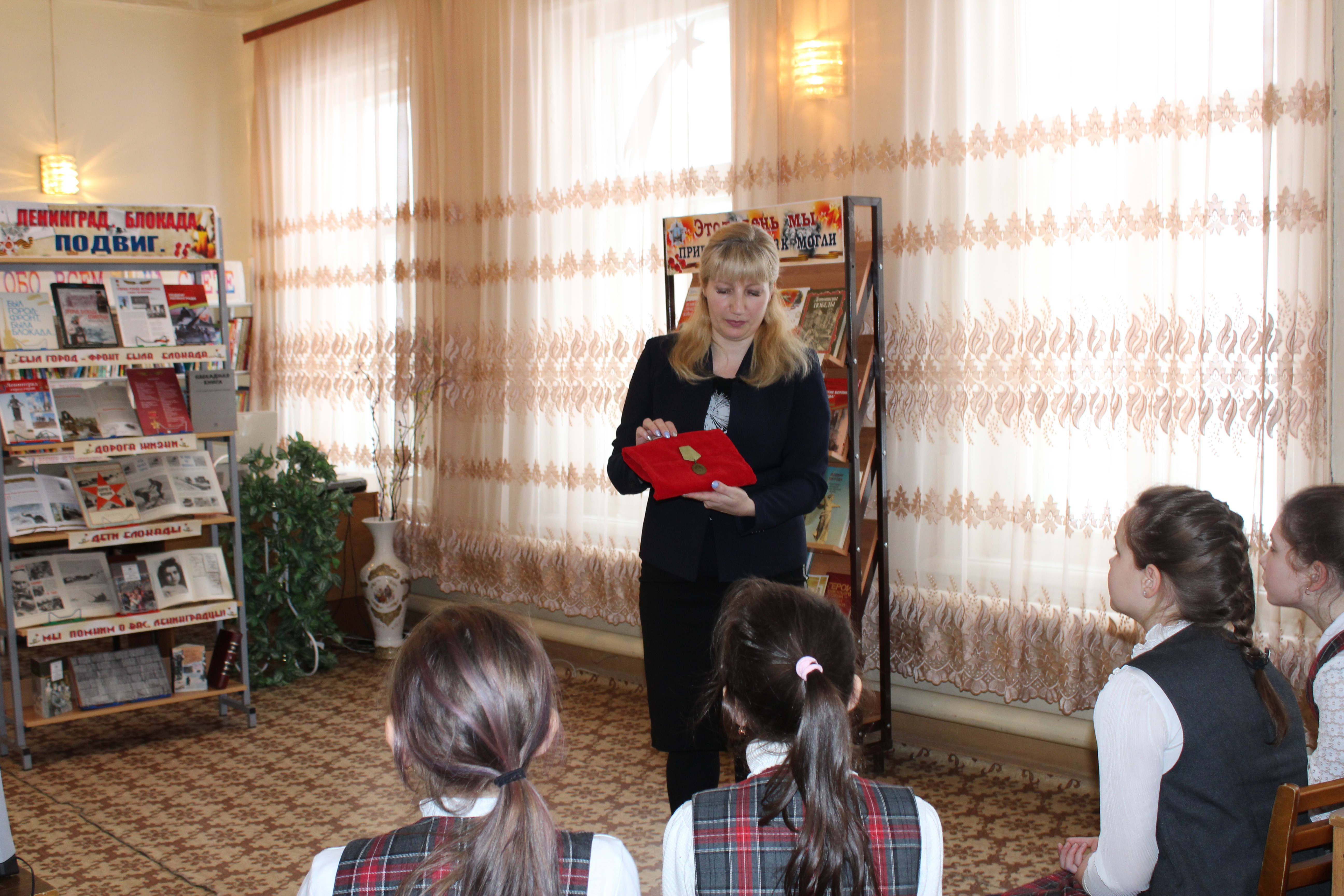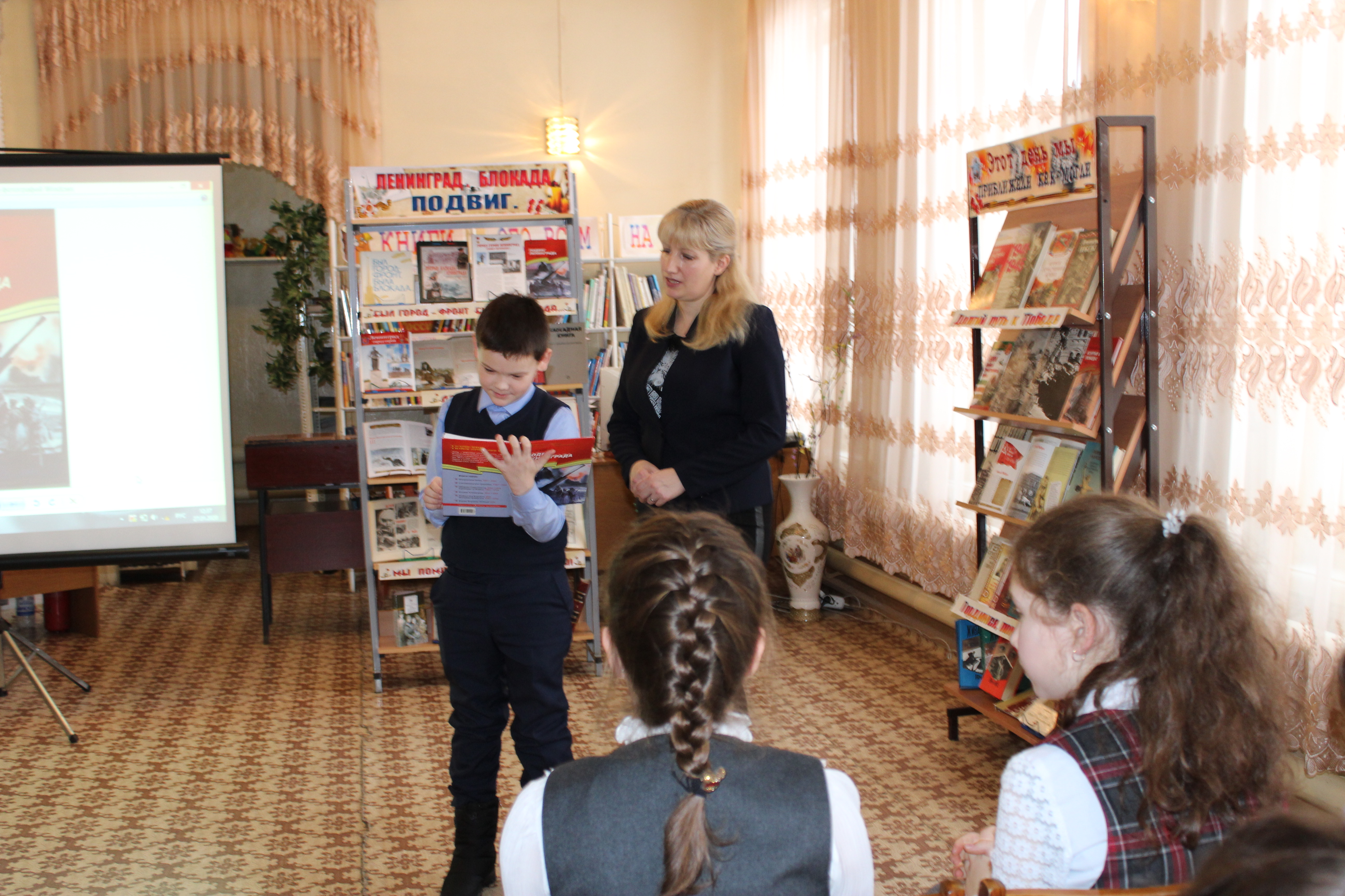 Ребята познакомились с произведением Сергея Алексеева «Буханка», рассказывающим о трудных испытаниях, выпавших на долю жителей осажденного города. В ходе обзора книжной выставки «Ленинград. Блокада. Подвиг» детям рассказали о книгах, которые на реальных примерах рассказывают о блокадной жизни.