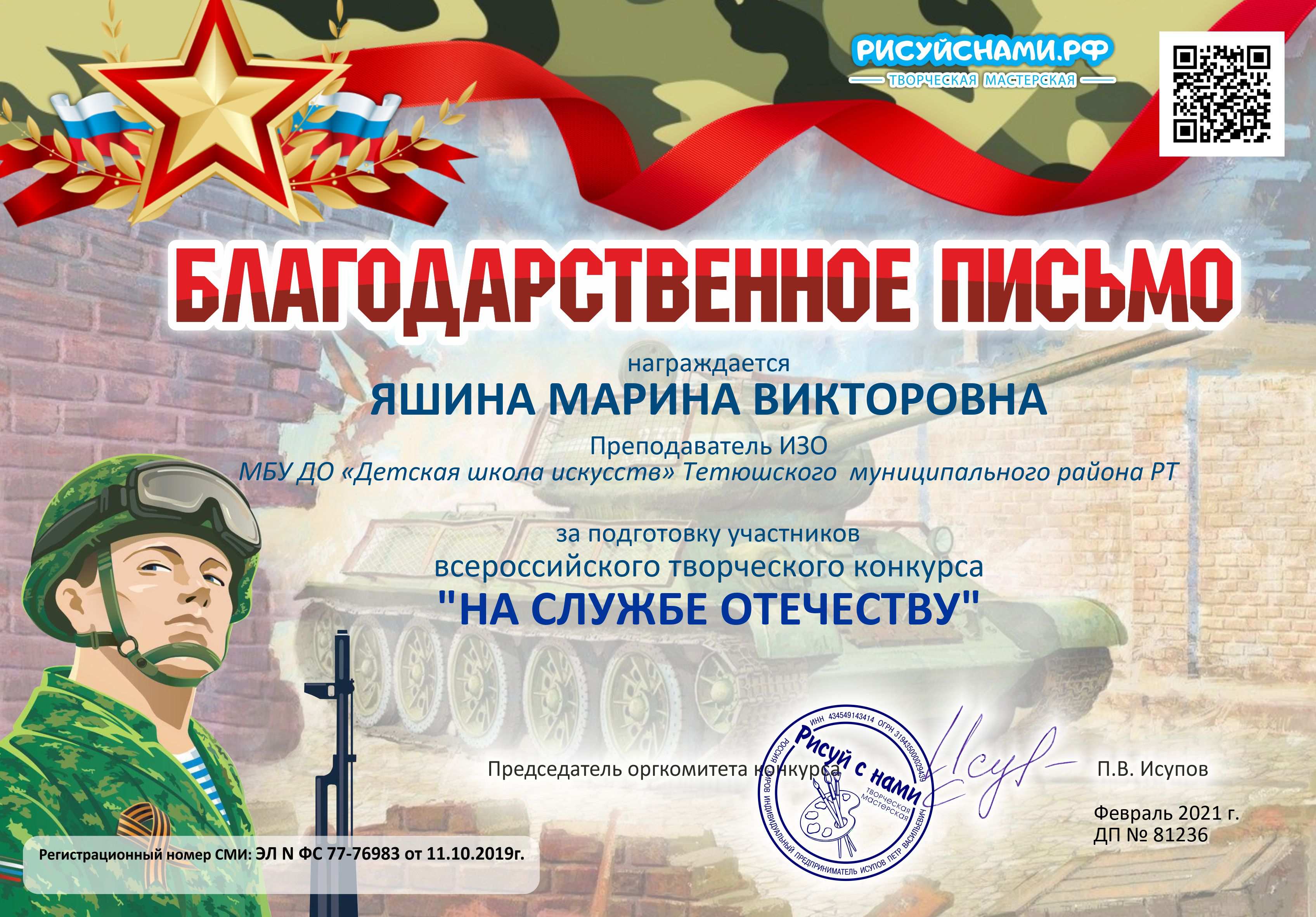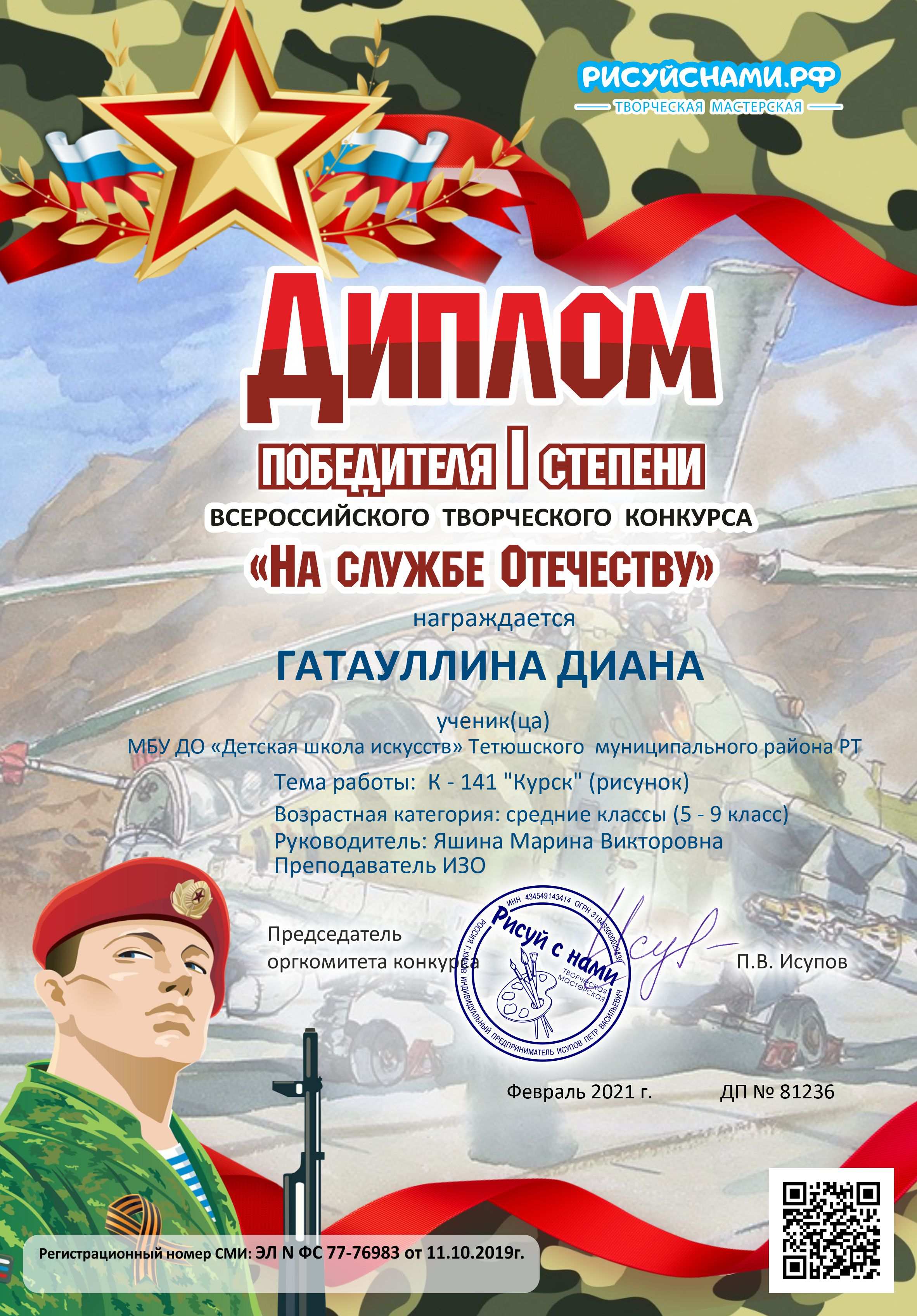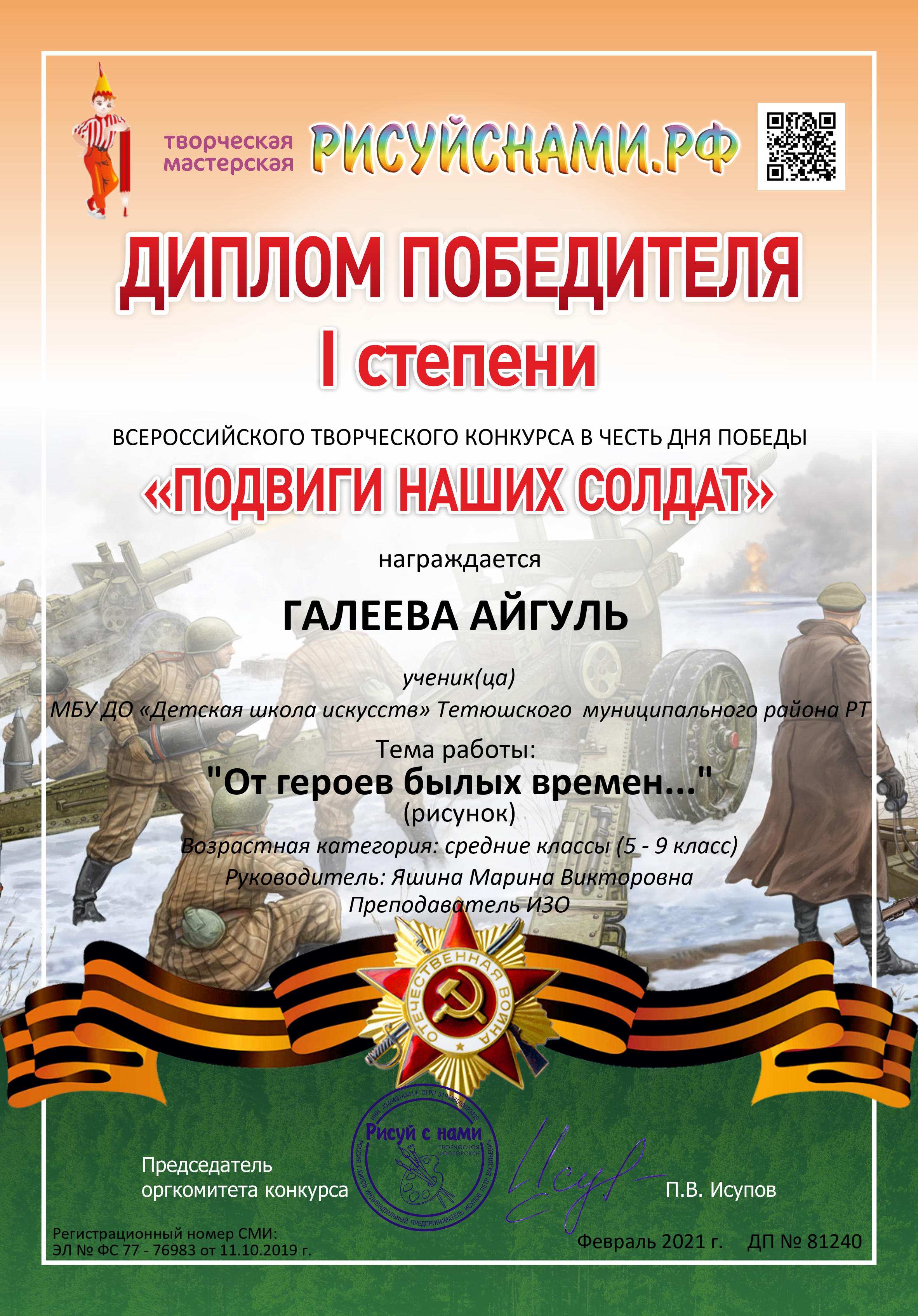 С 15 по 25 февраля 2021 года учащиеся Детской школы искусств художественного отделения под руководством преподавателя Яшиной М.В. приняли участие во Всероссийских творческих конкурсах: «На службе Отечеству», «Подвиги наших солдат», «Защитник Родины моей». Основные задачи конкурсов: сохранение преемственности поколений - сохранение памяти о важнейших событиях в истории нашей страны; пропаганда патриотических духовных ценностей, национальной гордости, уважения к чести и достоинству людей, выбравших своей профессией служение и защиту Отечества. Конкурсы проводились по соответствующим возрастным группам. В результате, по итогам конкурсов, в номинации "Рисунок" учащиеся Детской школы искусств Галиева Айгуль, Гатауллина Диана (3 класс ДШИ) и Старостина Элина (1 класс ДШИ) награждены Дипломом Победителя I степени. Учащиеся представили на конкурс творческие работы по теме: «От героев былых времен..», «Подводная лодка: Курск - 141» и «Горячий Кандагар». Преподаватель Яшина М.В. отмечена Благодарственным письмом оргкомитета за высокий профессионализм и творческий подход. Поздравляем!