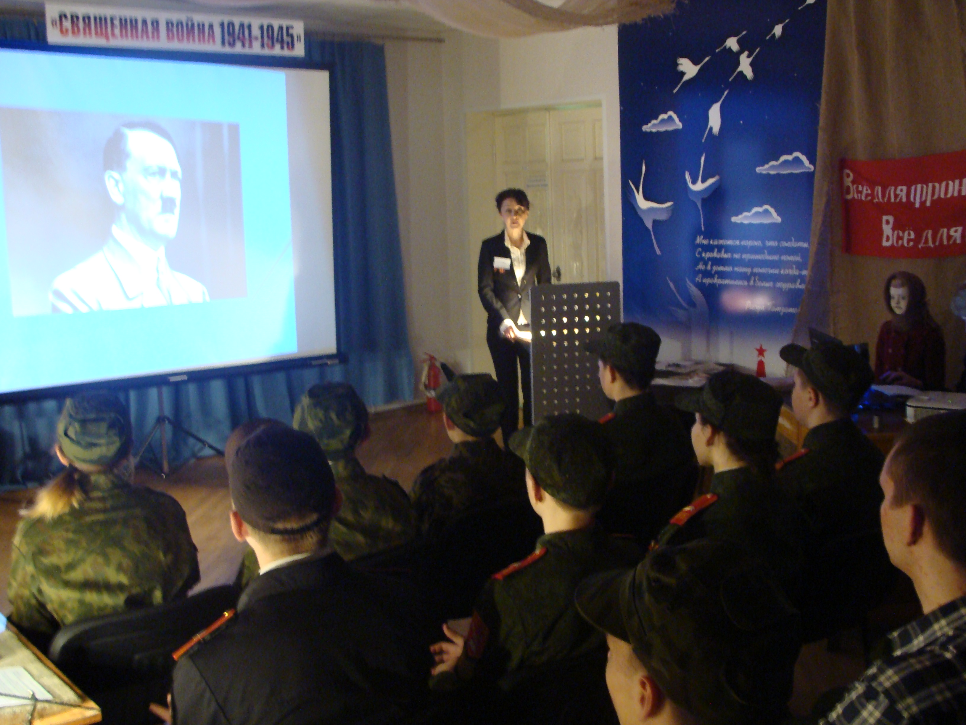 После построения все участники акции были приглашены на «Диалоги о войне». В ходе лекции — презентации ребята и взрослые погрузились в атмосферу военного времени. С экрана к слушателям обращались И.В.Сталин, Р.А.Руденко, В.М.Молотов. Демонстрировались кадры кинохроники, иллюстрирующие события военного времени, звучали песни, зачитывались стихи и страницы из дневников советских и немецких солдат. В завершении повествования к присутствующим обратился Солдат Великой Отечественной войны…