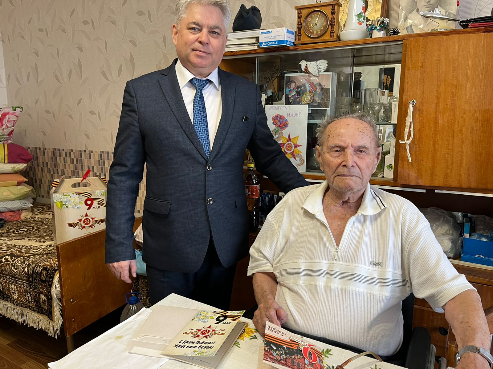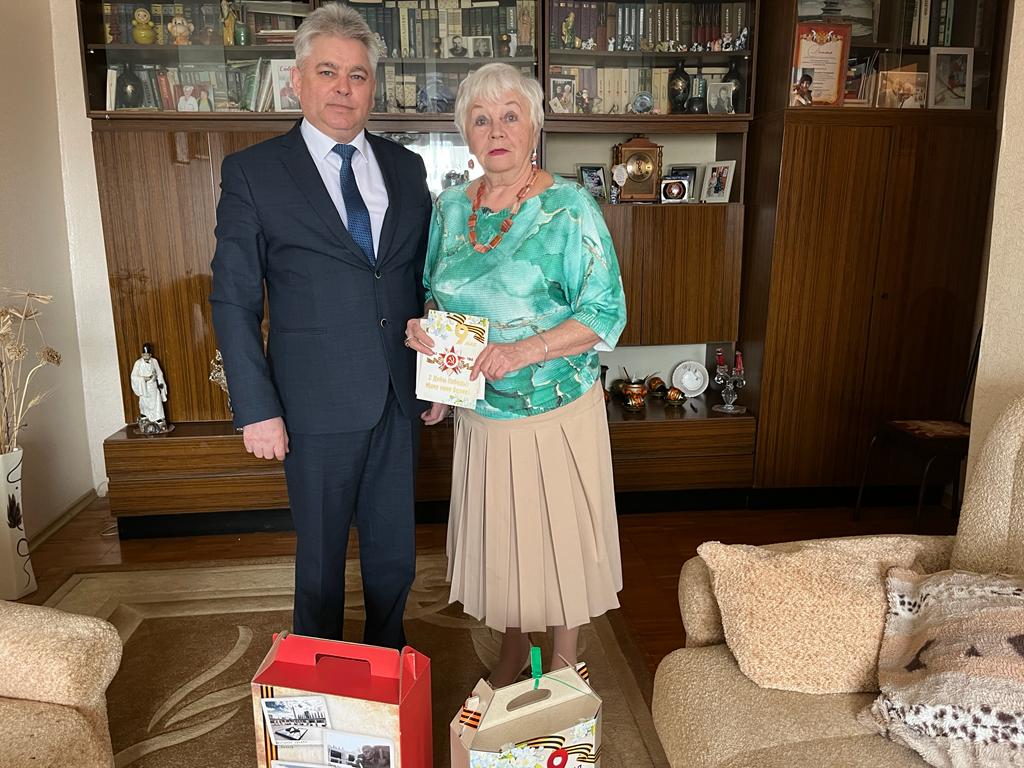 Глава района выразил искренние слова благодарности за мирное небо над головой и вручил подарки и поздравительные открытки.