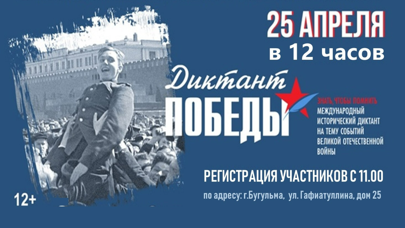 25 апреля Бугульма присоединится к международной патриотической акции «Диктант Победы». Площадкой проведения акции станет Бугульминская кадетская школа. Всего в Татарстане для написания диктанта будет подготовлено 340 площадок.