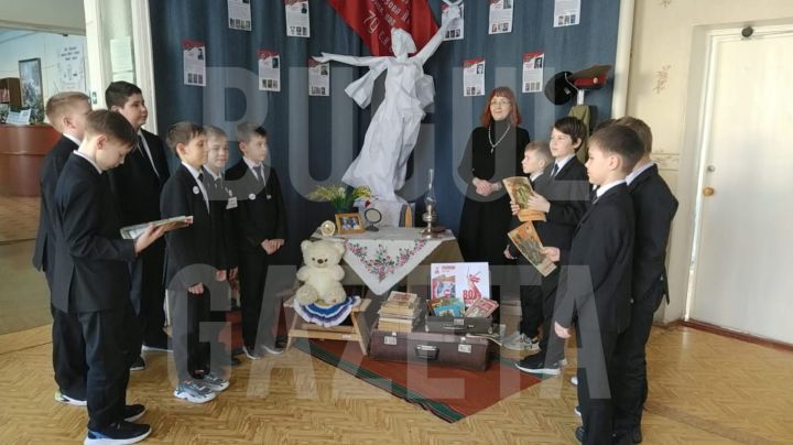 В фойе учреждения была представлена тематическая экспозиция, погружающая в атмосферу времен Великой Отечественной войны. Центральное место экспозиции занимал макет монумента «Родина-мать», величественно символизируя подвиг народа. Также здесь размещались разнообразные предметы солдатского быта: военная форма, керосиновая лампа, чайник и кружка, которые помогали создать образ жизни рядового солдата. Кроме того, внимание привлекали фотографии военных лет, фронтовые треугольники писем и книги, в которых детские писатели рассказывают о войне 1941-1945 годов.