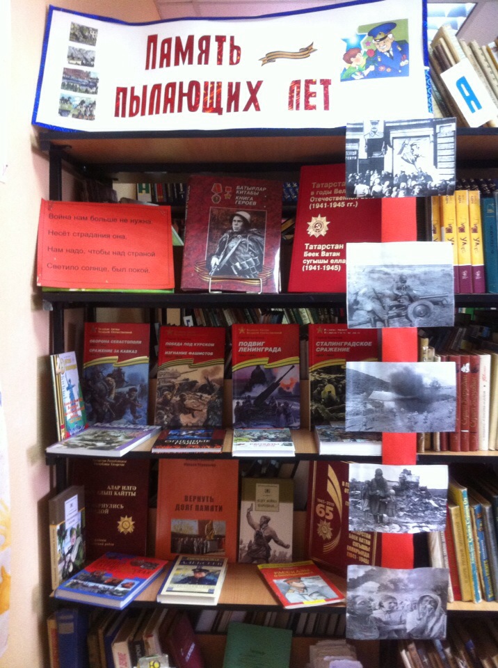 В Центральной районной библиотеке с.Новошешминск организована выставка "Память пылающих лет". На выставке представлены книги, посвящённые тем ребятам, которые за подвиги в годы Великой Отечественной войны, удостоены самой высокой награды Родины – звания Героя Советского Союза. Здесь также можно познакомиться с фотоматериалом о главных битвах Великой Отечественной войны.