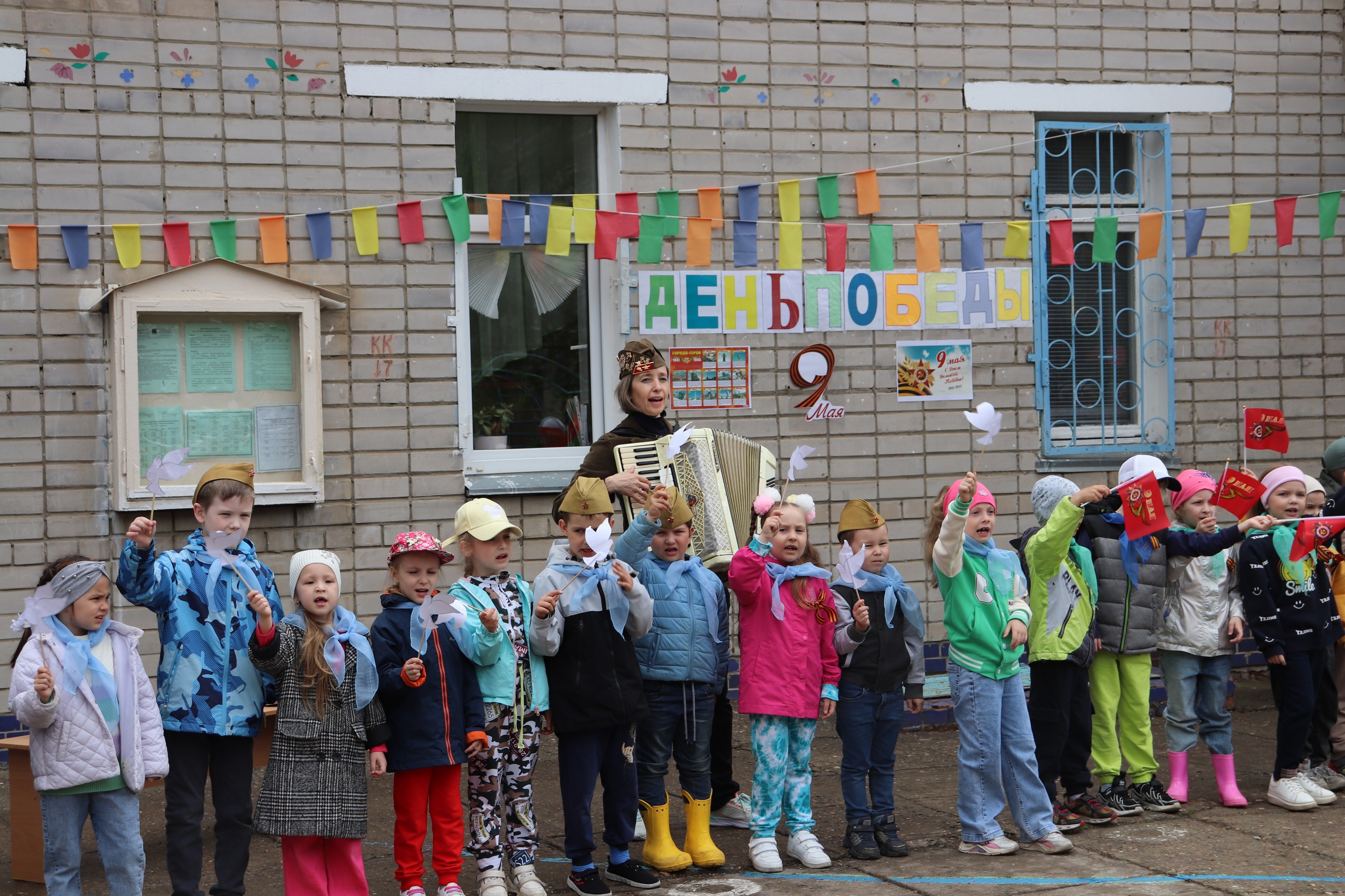 Прозвучали стихи, песни и инструментальные композиции военных лет в исполнении педагогов и воспитанников Балкыш, кульминацией праздника стал флешмоб "Голубь мира".