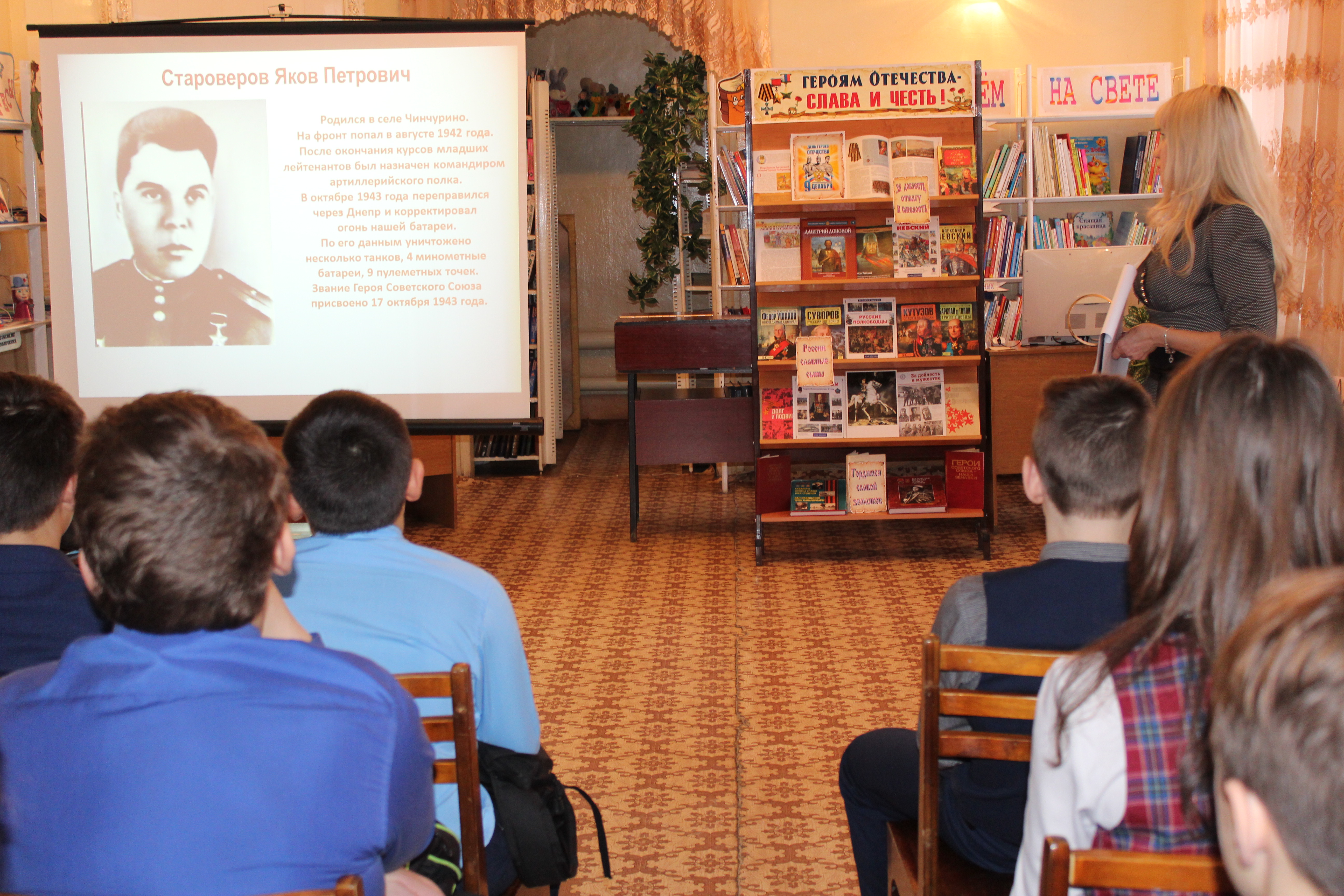 Мероприятие сопровождалось электронной презентацией и завершилось обзором книг с выставки «Героям Отечества – слава и честь», оформленной сотрудниками библиотеки к этой памятной дате.