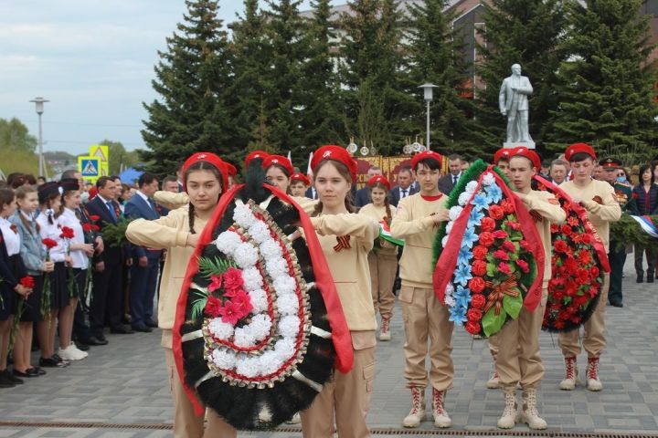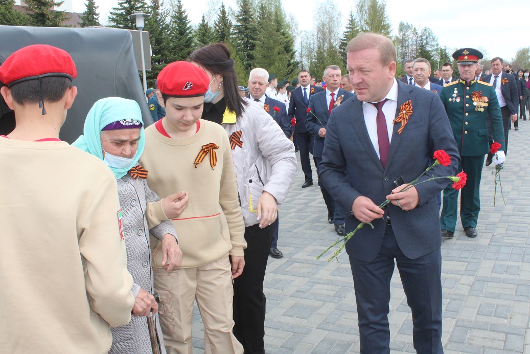 Глава района Марат Гафаров, гости, руководители района, юнармейцы возложили венки и цветы к вечному огню у обелиска Боевой и Трудовой Славы. На торжественном митинге, у Вечного огня, к жителям района обратился глава Дрожжановского муниципального района Марат Гафаров.