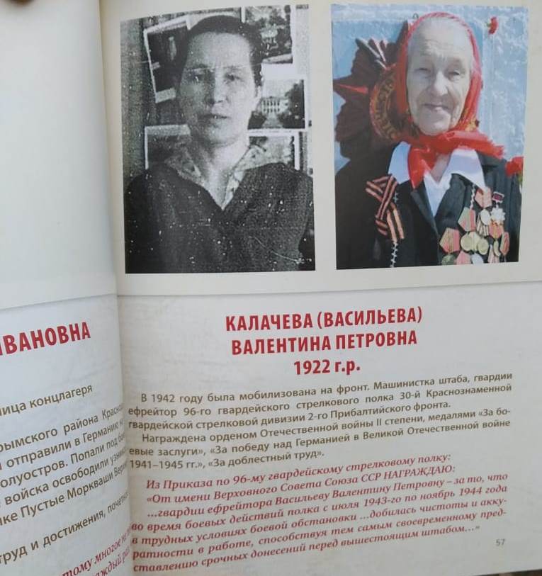 История жизни Валентины Калачевой из Дрожжановского района отражена в данном издании. Книга была издана в рамках социально-гуманитарного проекта «У войны не женское лицо…» объединения женщин-депутатов «Мэрхэмэт-Милосердие».