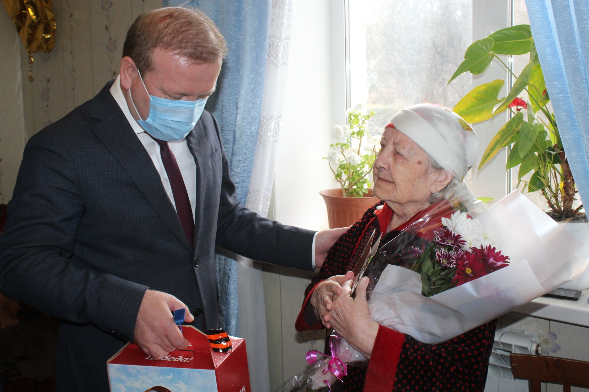 Вручая подарки Марат Ринатович выразил благодарность и признательность за те испытания, через которые им пришлось пройти в годы ВОВ и за их ратный и трудовой подвиг. Пожелал им здоровья, мира и добра, благополучия.